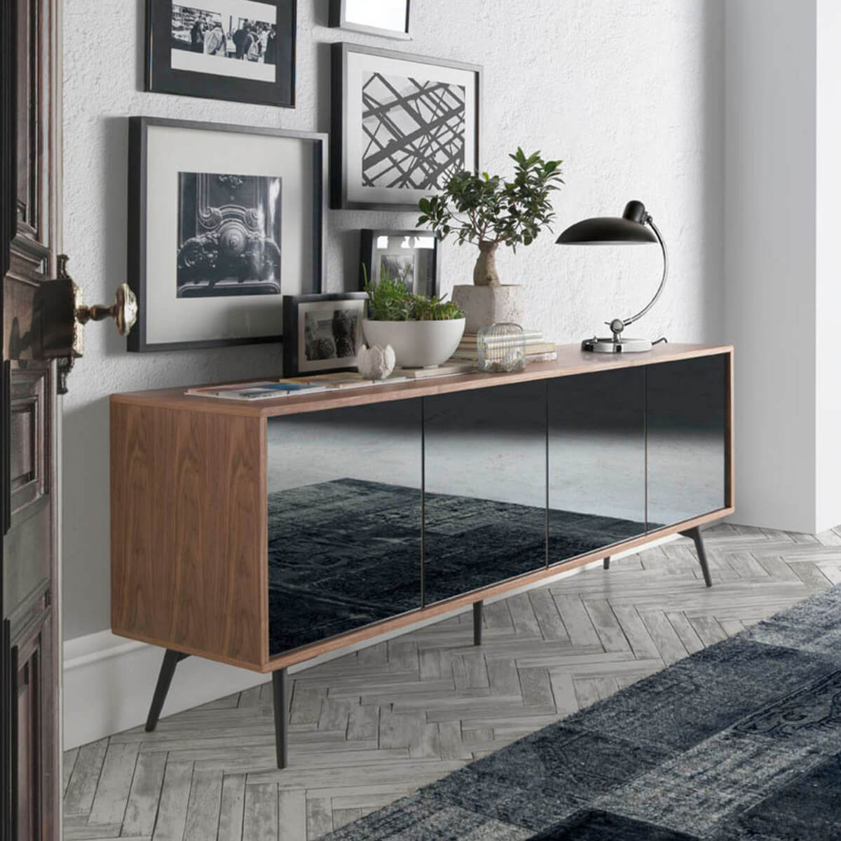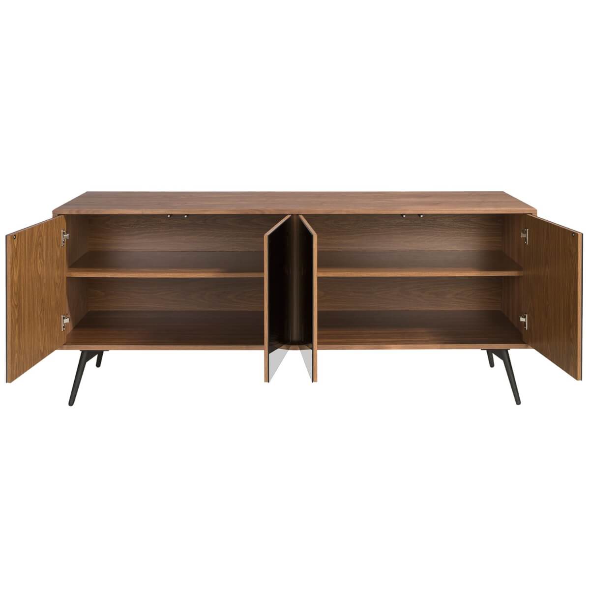 Modern dizájnú tálalószekrény natúr dió furnérral borított fa szerkezettel és eredeti fekete epoxigyantás rozsdamentes acél lábakkal. Eredeti fekete tükrös üvegrészletei tökéletes stílust kölcsönöznek nappalijának. Nagy tárolóhellyel rendelkezik, 4 ajtóval, toló-húzó nyílással és lágyan záródó rendszerrel.