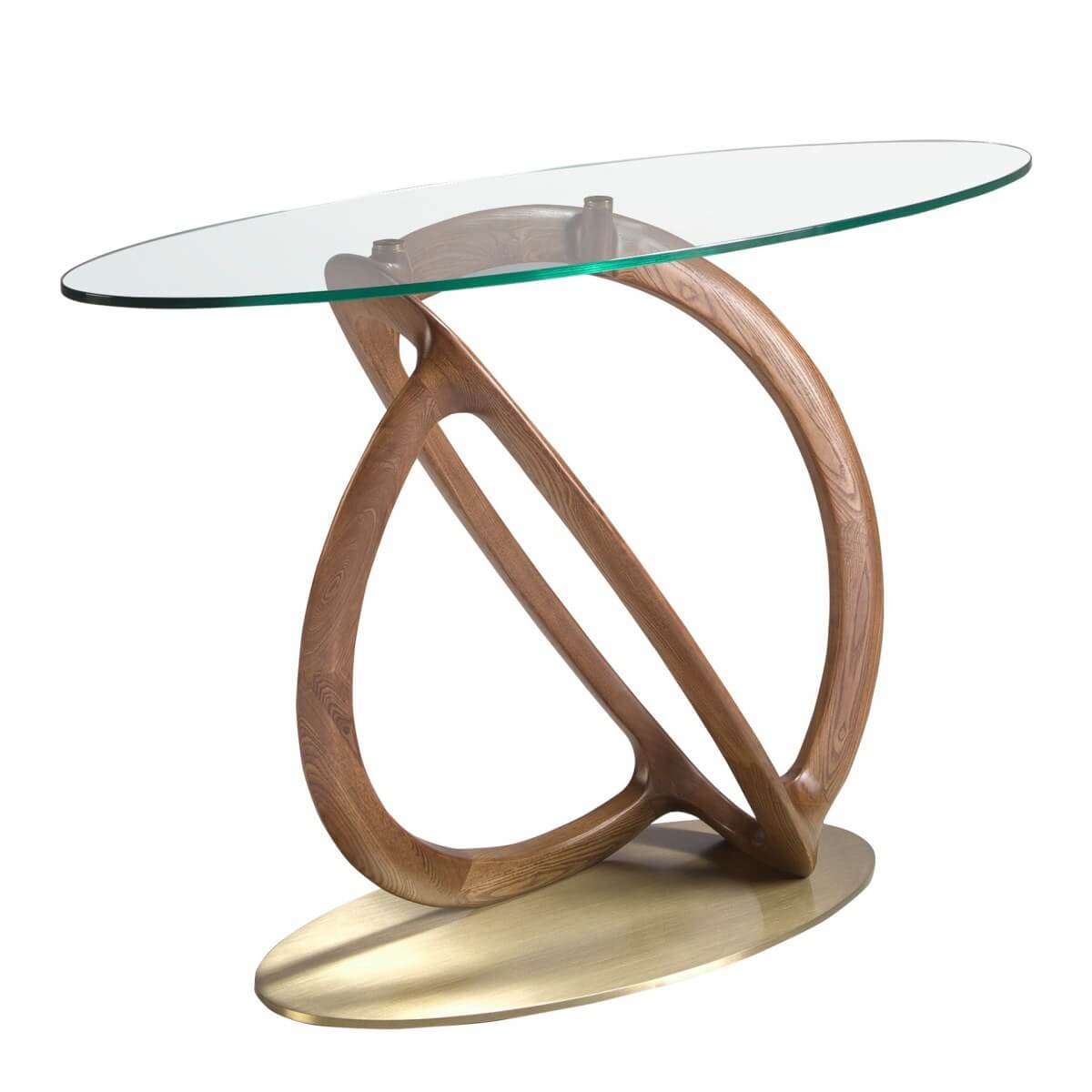 Modern ovális konzolasztal edzett üveglappal és eredeti dió színű fa lábakkal. Ez a polírozott rozsdamentes acél talppal ellátott, arany színű konzolasztal tökéletes otthonába, hogy fényt és avantgárd stílust vigyen.