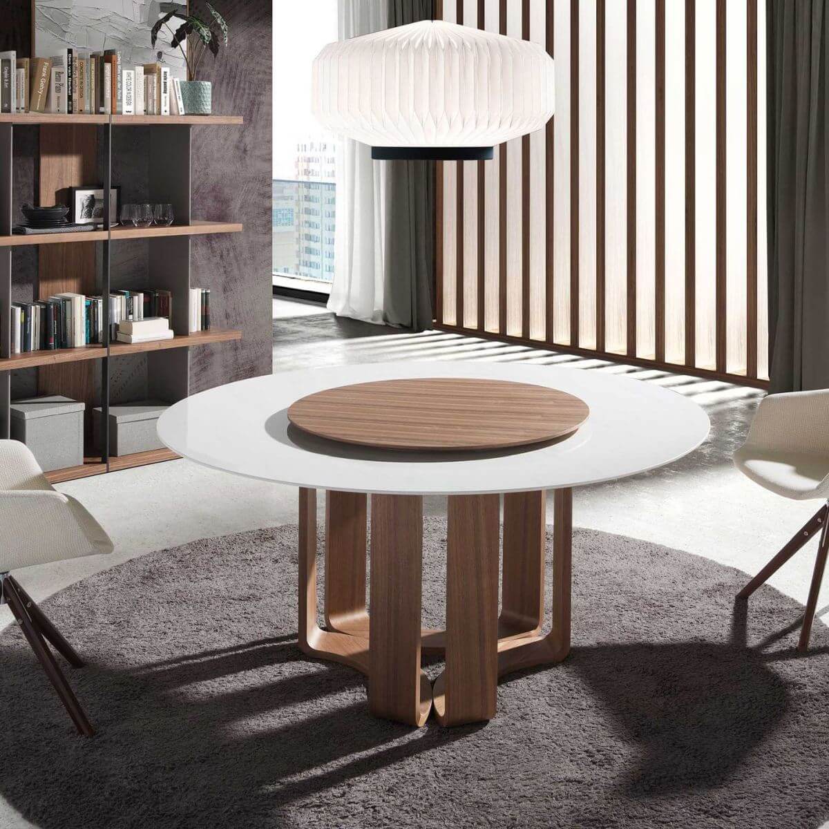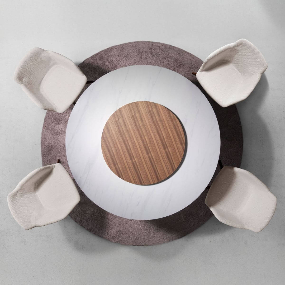Modern kerek étkezőasztal fix tetejű fehér porcelán márványból, fényes szürke erezettel. Eredeti, natúr dió furnérból készült falábai kulcsfontosságú elemei a dizájnnak.