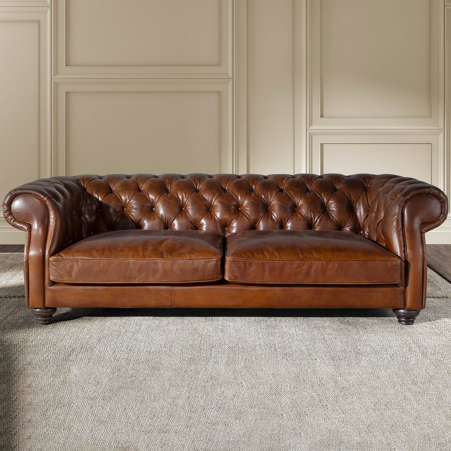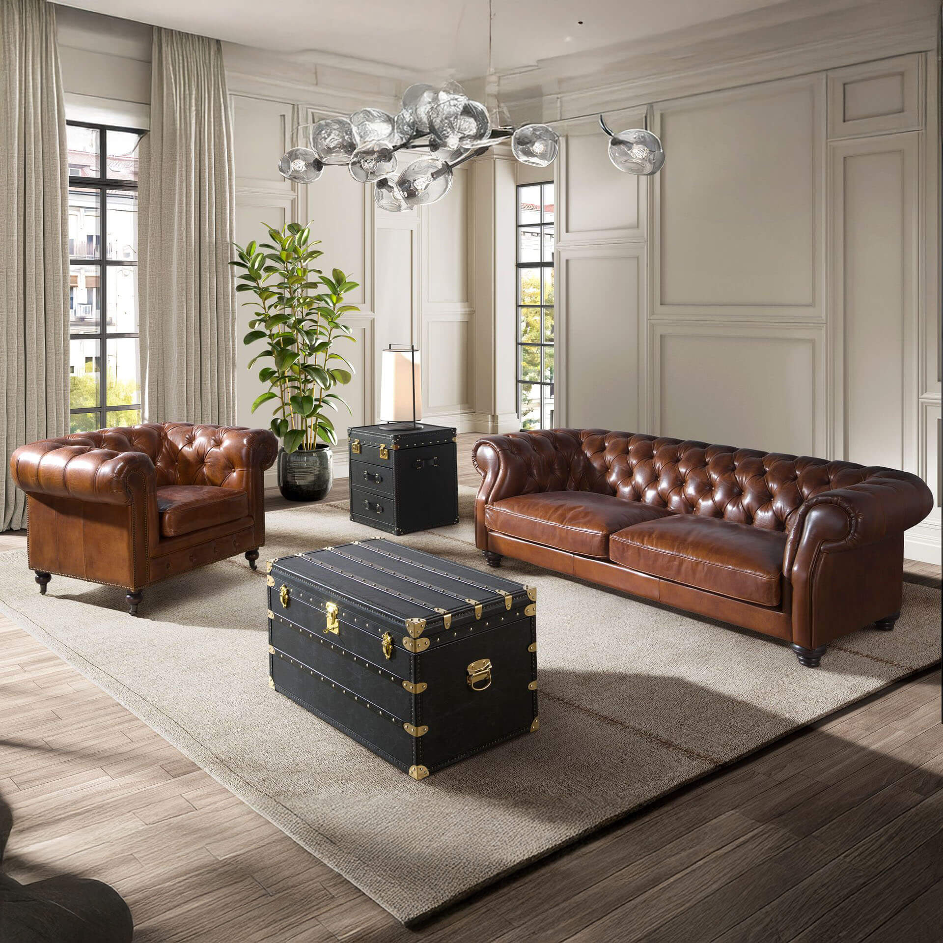 Chester 3 személyes kanapé modern dizájnnal, konyakbarna marhabőrrel kárpitozva. Stílusának és mahagóni színűre pácolt tömörfa lábainak köszönhetően ez a kanapé egy csipetnyi avantgárdot és eleganciát visz otthonába, amire vágyik.