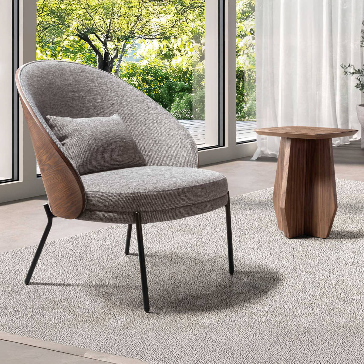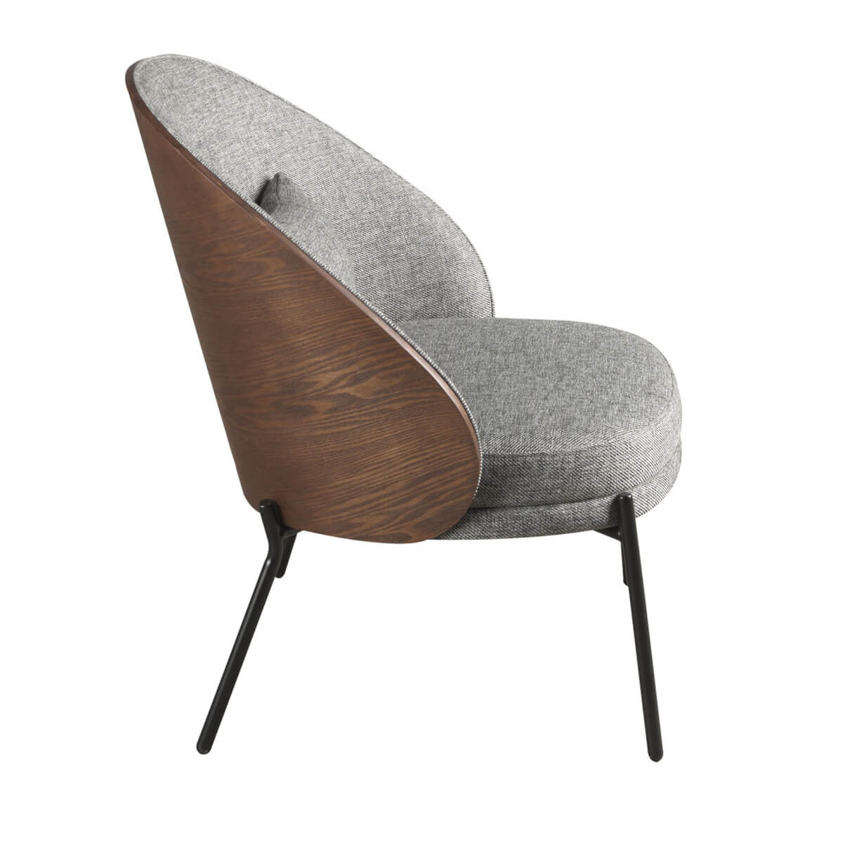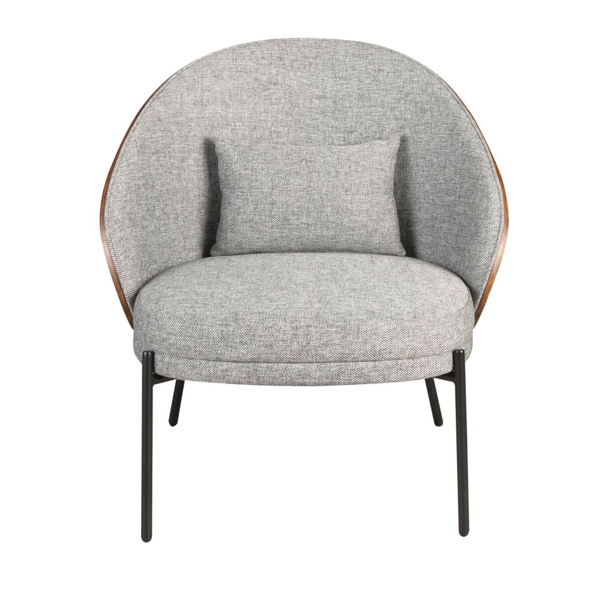 Modern dizájnú karosszék szürke szövettel kárpitozott ülőfelülettel és háttámlával. Az elegáns, natúr diófa furnér fafelület az avantgárd és egyedi megjelenést kölcsönöz otthonának, amelyet keres. Stílusának és fekete rozsdamentes acél lábainak köszönhetően ez a karosszék a dizájn és a kényelem tökéletes kombinációja.