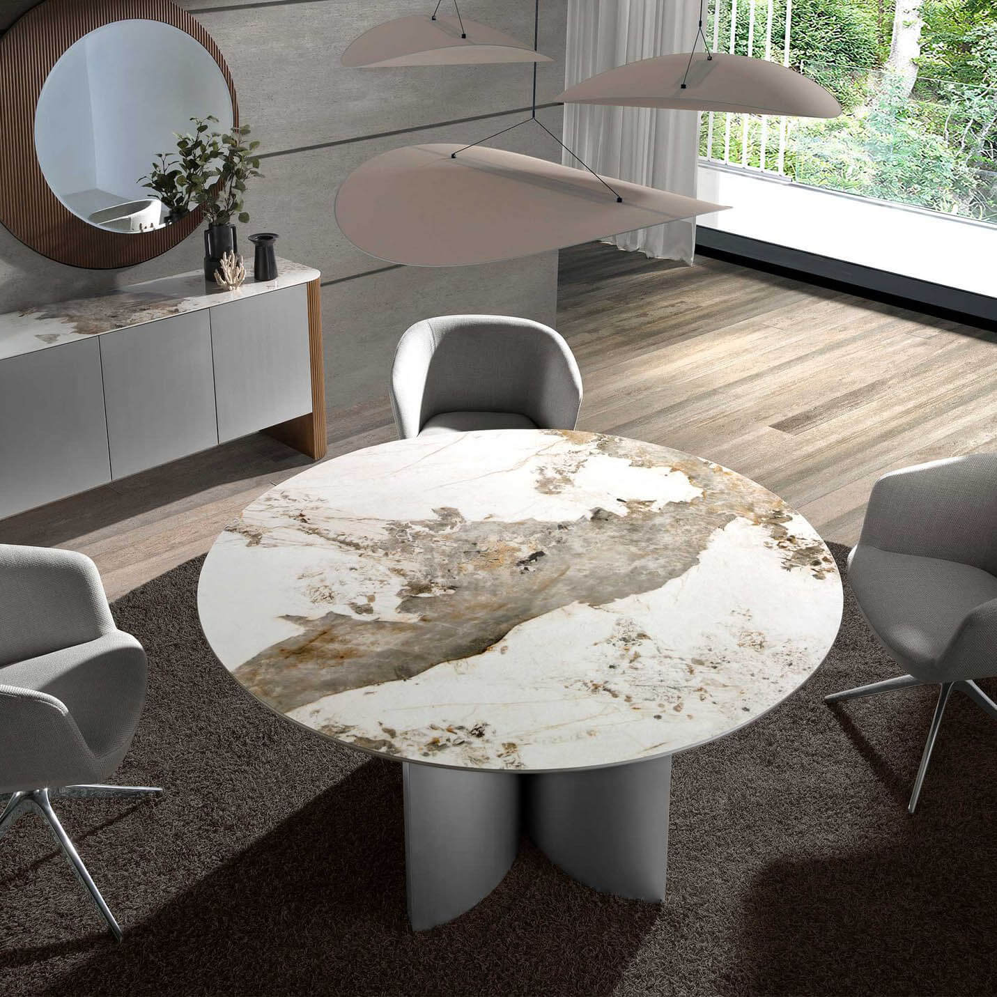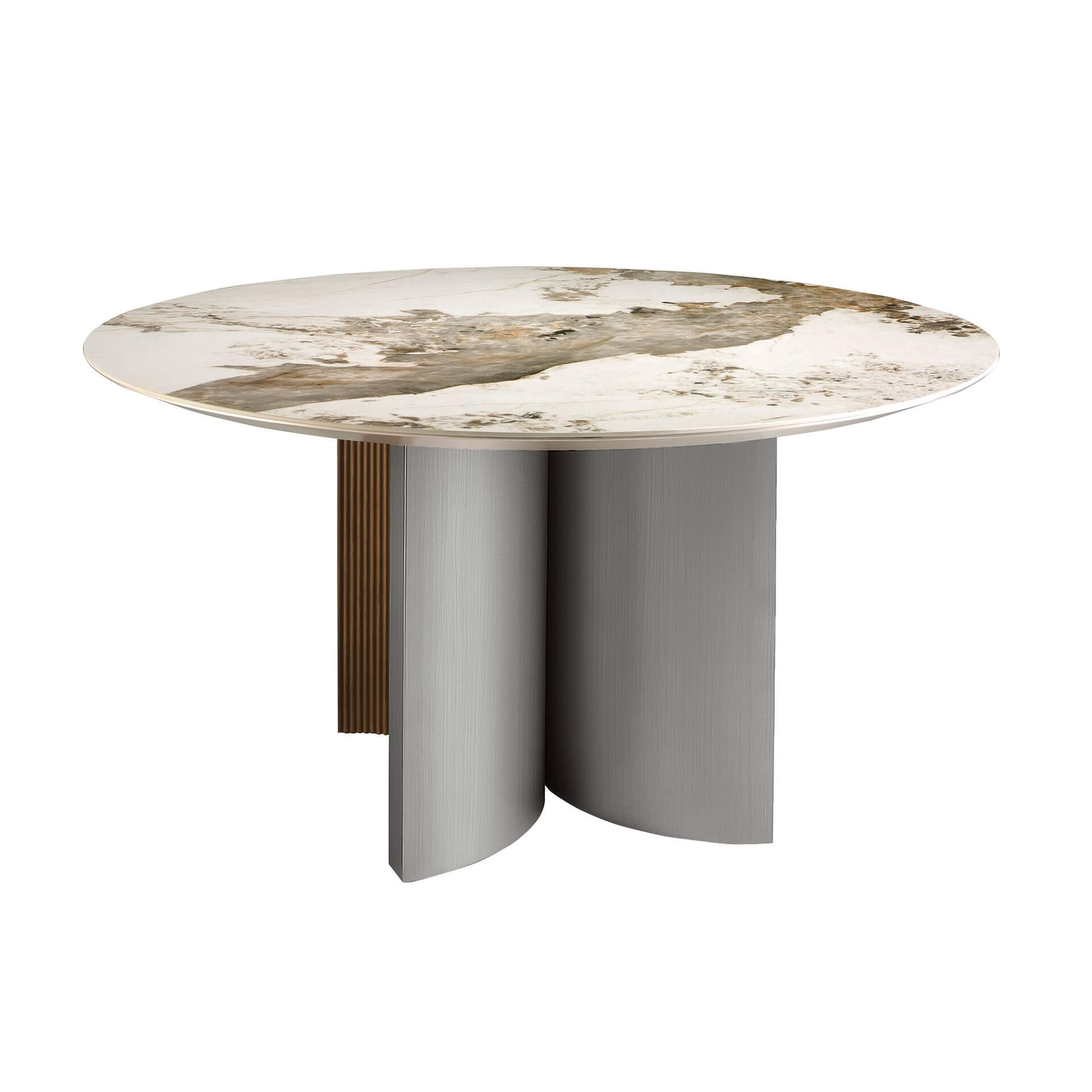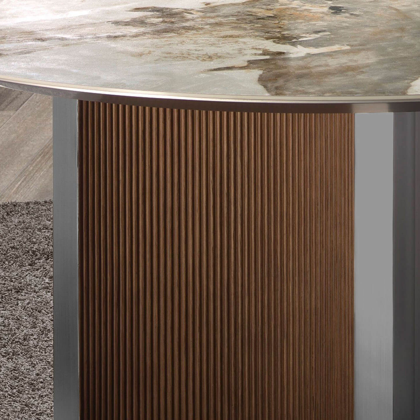Modern kerek étkezőasztal fix tetejű fehér porcelán márványból, földszínű erezettel, fényes felülettel. Eredeti dió színű falábai és ezüst színű lakkozott MDF falapjai kulcsfontosságú elemei a dizájnnak.