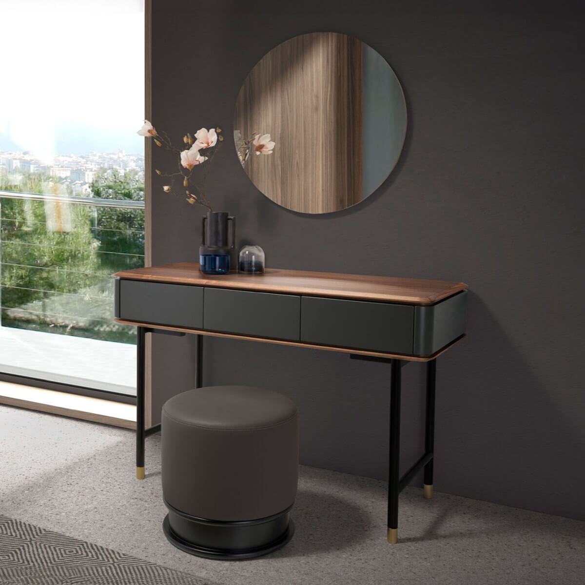 Modern téglalap alakú konzolasztal sötétszürke MDF-ből, matt felülettel és elegáns, natúr dió furnér fa asztallappal. Fekete rozsdamentes acél lábai modern és avantgárd stílust kölcsönöznek otthonának. Eredeti, arany színű, polírozott rozsdamentes acél részletei tökéletes stílust kölcsönöznek nappalijának.