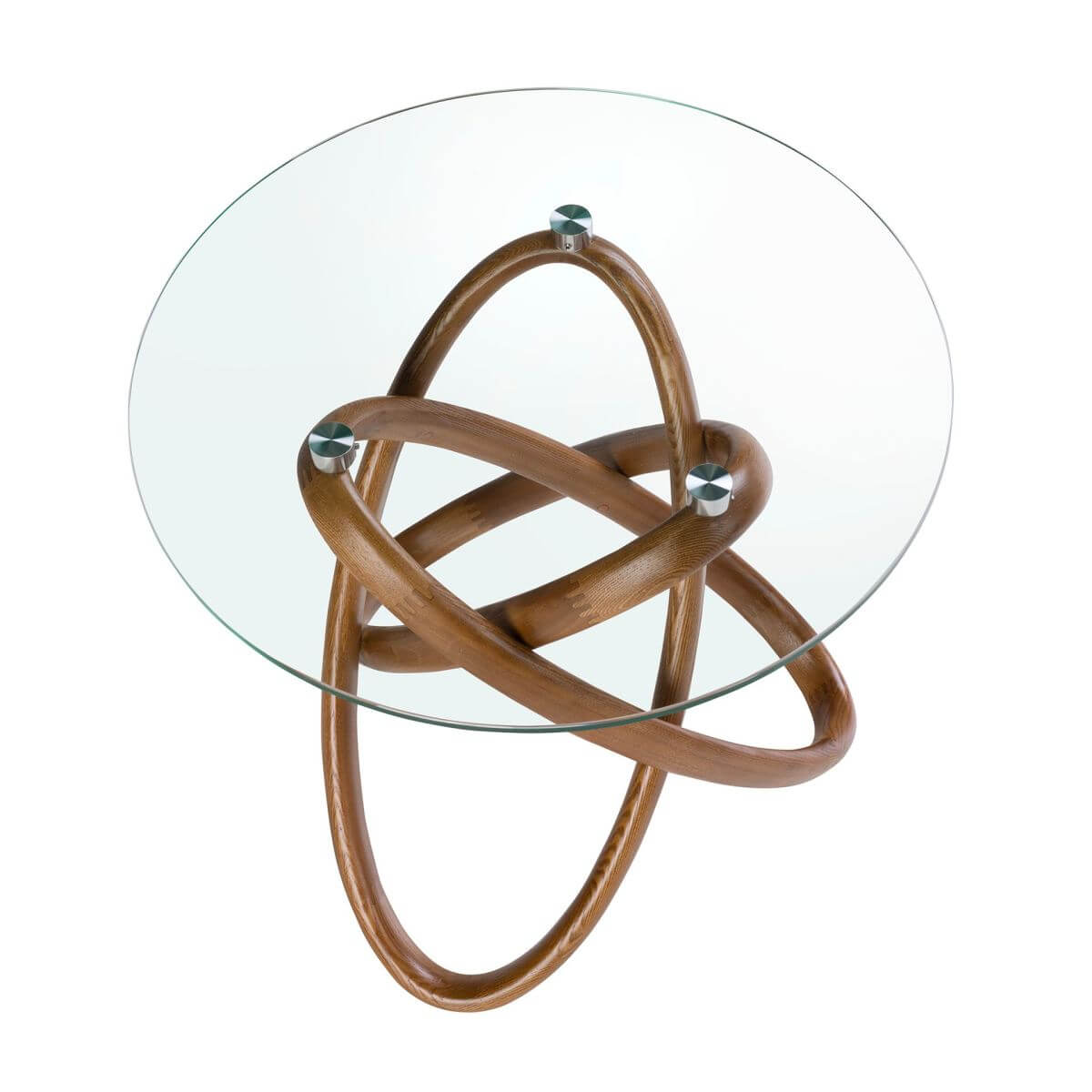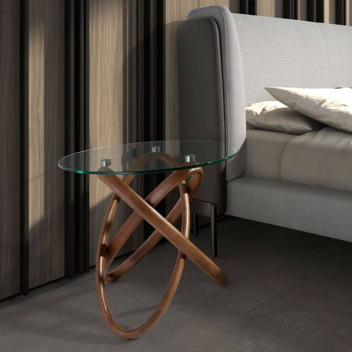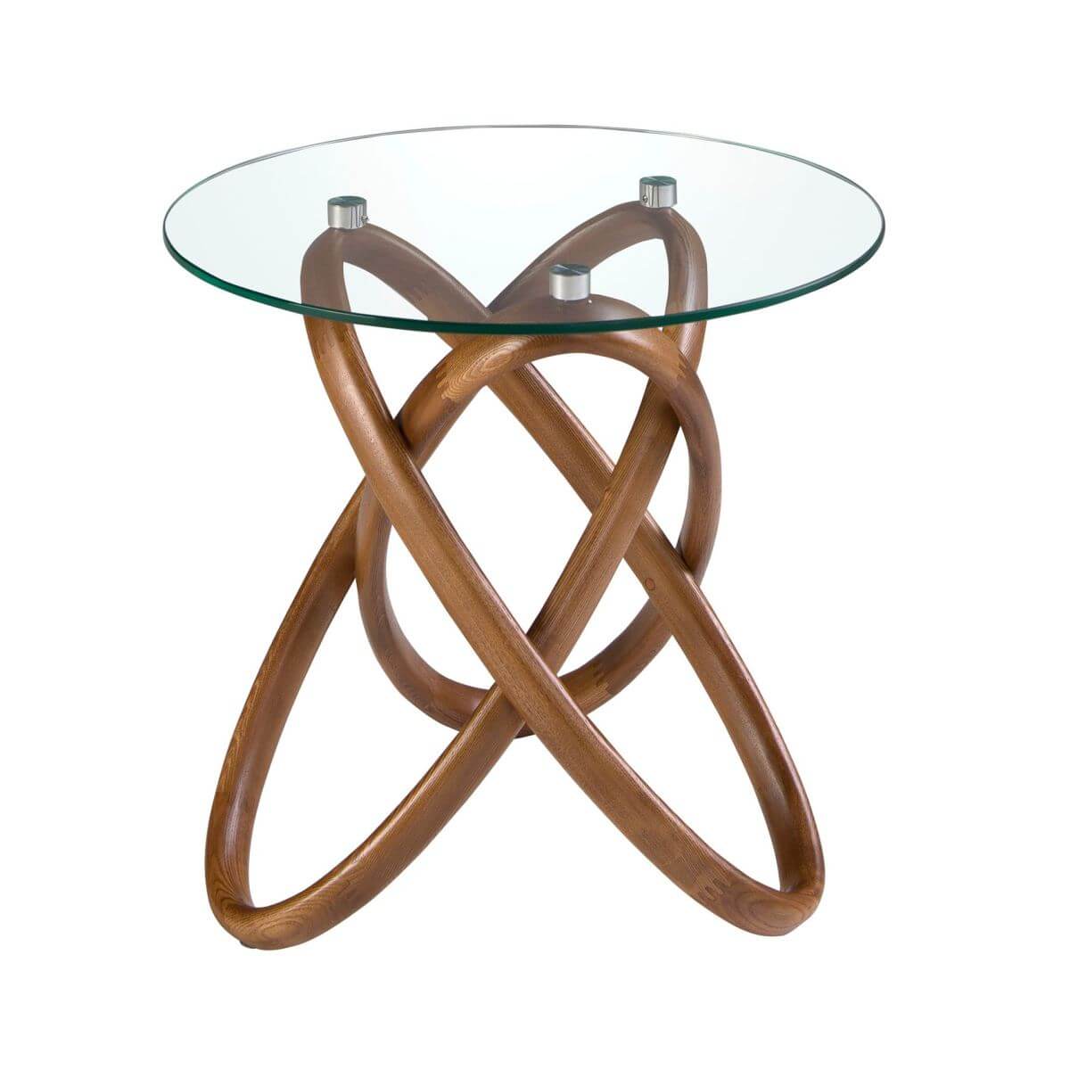 Modern, kerek sarokasztal edzett üveglappal és eredeti dió színű fa lábakkal. Egy egyszerű, mégis eredeti dizájnnal rendelkező darab, amely egyedi és személyes jelleget kölcsönöz a helyiségnek.