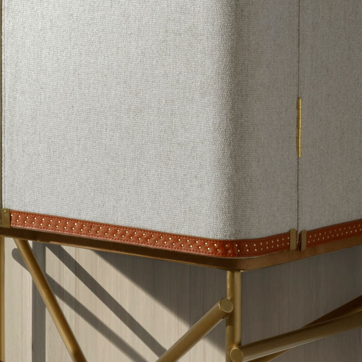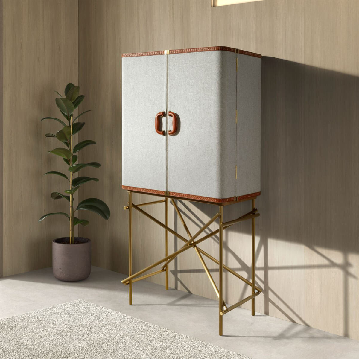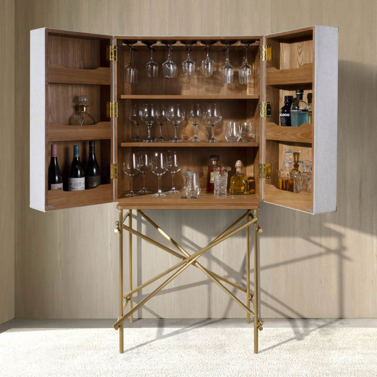Modern dizájnú, natúr diófa furnérral borított, világos szürke szövettel kárpitozott, eredeti, polírozott, arany színű rozsdamentes acél lábakkal ellátott, magas tálalószekrény. Eredeti marhabőr részletei tökéletes stílust kölcsönöznek nappalijának.