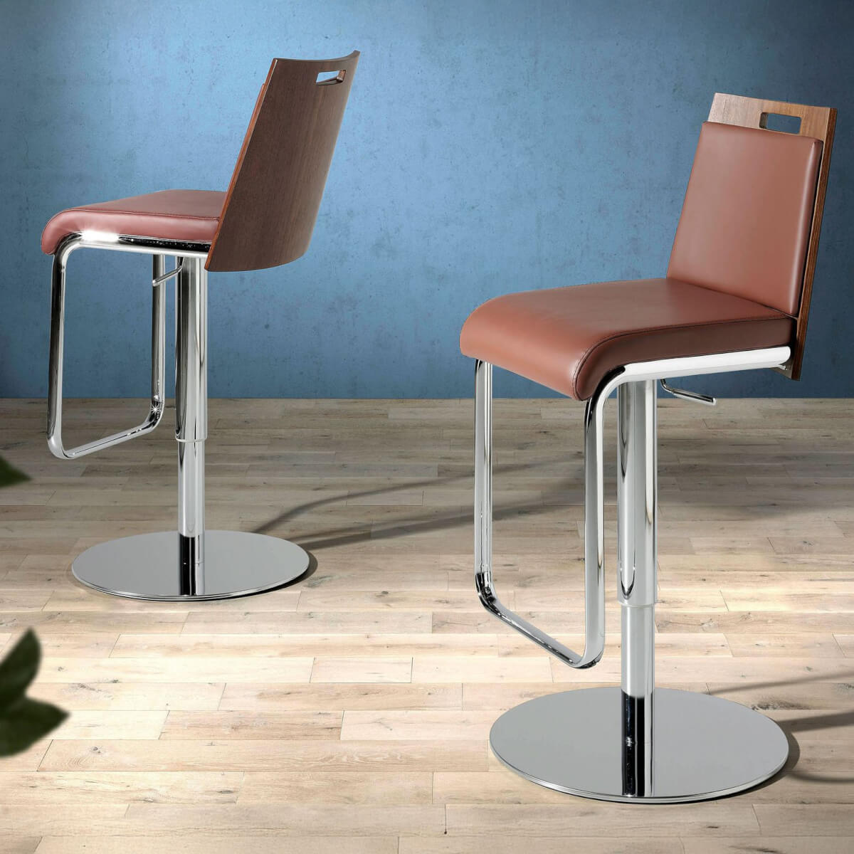 Modern forgó bárszék barna nercbőrrel kárpitozott ülőfelülettel és háttámlával. Az elegáns, natúr diófa fafelület különleges megjelenést kölcsönöz otthonának. Krómozott rozsdamentes acél lábai avantgárd, mégis időtlen stílusukkal kötelező darab konyhájában vagy étkezőjében.