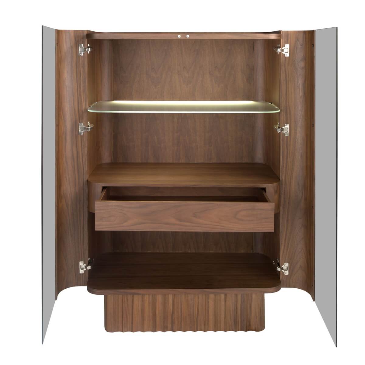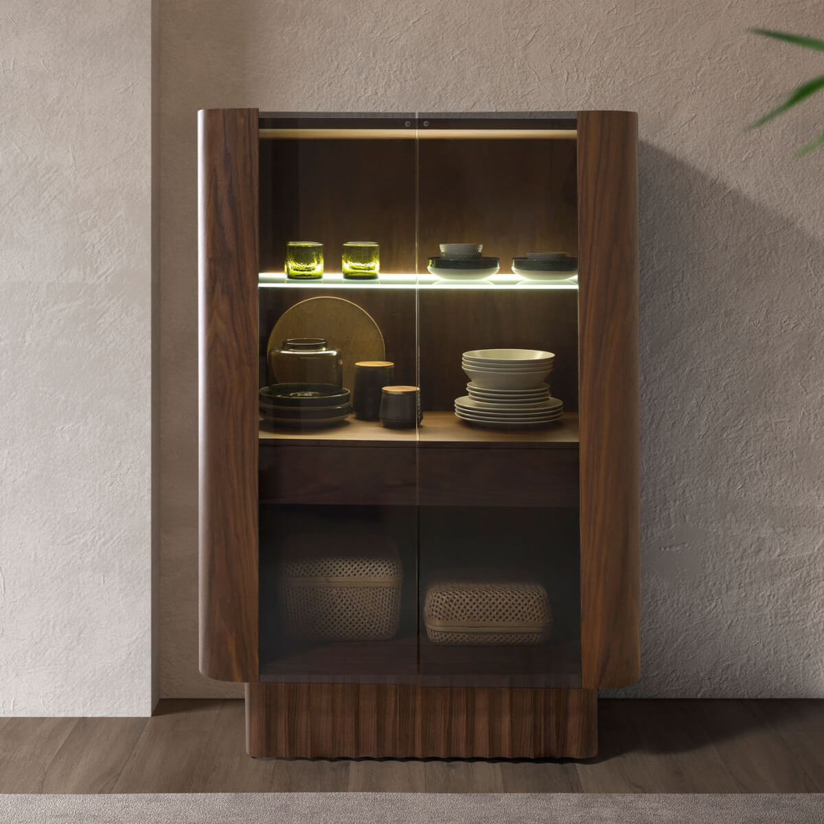 Modern dizájnú, magas tálalószekrény natúr diófa furnérral borított fa szerkezettel és eredeti diófa furnér lábazattal. A magas tálalószekrény belső világítása lehetővé teszi, hogy meleg és nyugodt légkört teremtsen, miközben jobb rálátást biztosít a bútorok belsejére. Eredeti edzett üveg részletei tökéletes stílust kölcsönöznek nappalijának. Nagy tárolóhellyel rendelkezik, 1 fiókkal, lágyan záródó rendszerrel, és 2 ajtóval, lágyan záródó rendszerrel.