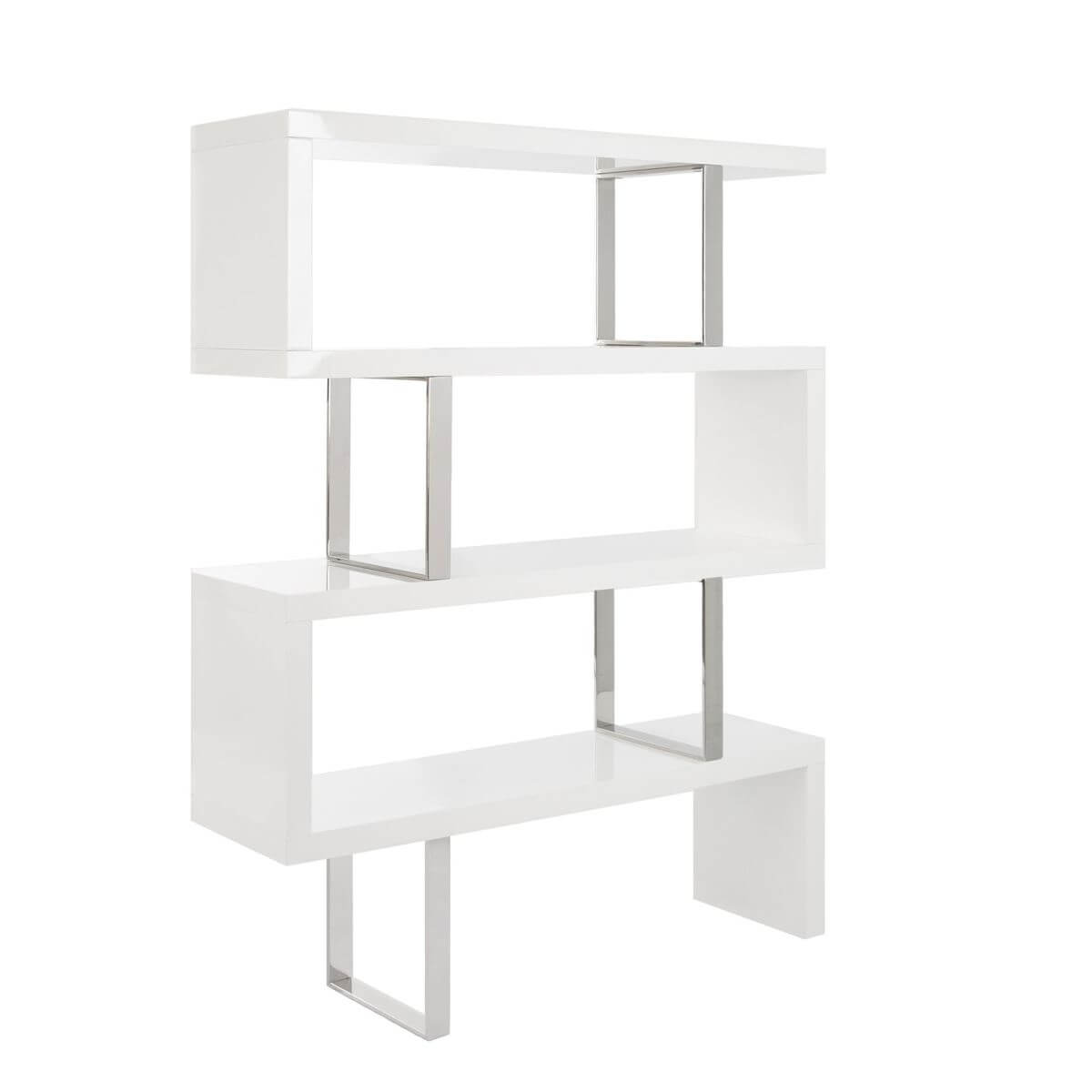 Fényes fehér fa polc krómozott rozsdamentes acél csatlakozókkal.
