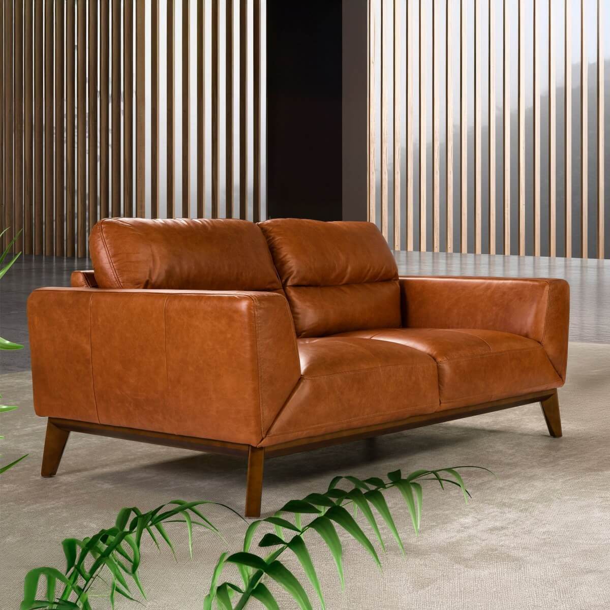 Modern dizájnú, kétszemélyes kanapé, barna marhabőrrel kárpitozva. Stílusának és dió színű fa lábainak köszönhetően ez a kanapé az avantgárd és elegancia érzetét kelti otthonában.