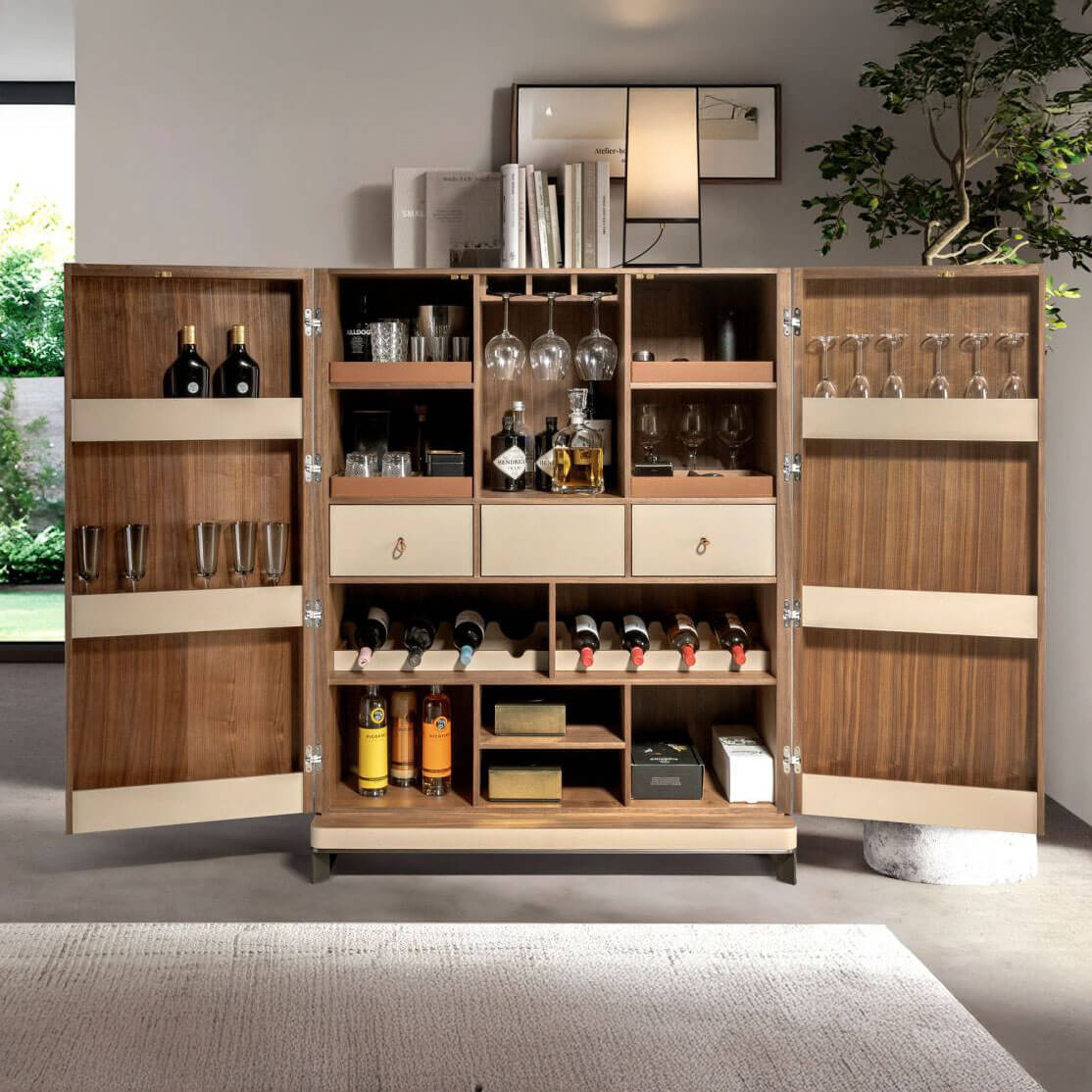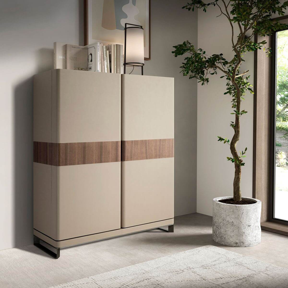 Modern dizájnú, magas tálalószekrény natúr diófa furnérral borított fa szerkezettel, nerc színű marhabőrrel kárpitozva és eredeti polírozott rozsdamentes acél lábakkal. Nagy tárolóhellyel rendelkezik, 3 fiókkal, húzófüles nyitással és lágyan záródó rendszerrel, valamint 2 ajtóval, húzófüles nyitással és zárással.