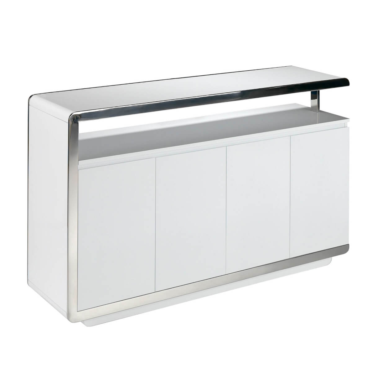 Modern dizájnú tálalószekrény fehér MDF fa szerkezettel és eredeti krómozott rozsdamentes acél talppal. Eredeti krómozott rozsdamentes acél részletei tökéletes stílust kölcsönöznek nappalijának. Nagy tárolóhellyel rendelkezik, 4 ajtóval, körmös nyitórendszerrel és lágyan záródó rendszerrel.