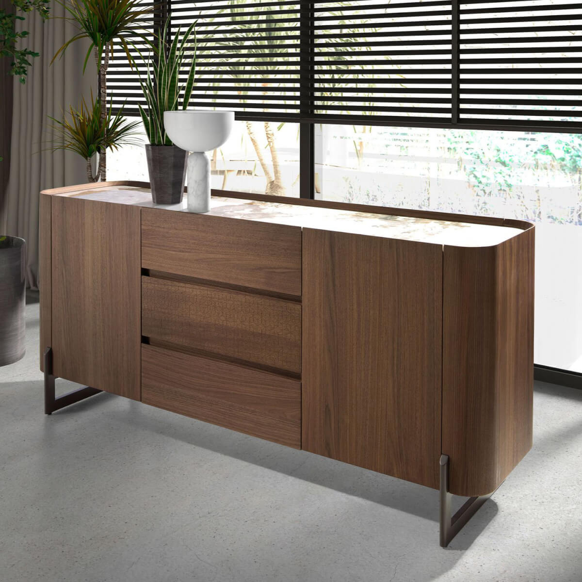 Modern dizájnú tálalószekrény natúr diófa furnérral borított fa szerkezettel és eredeti sötét metál rozsdamentes acél lábakkal. Elegáns fehér porcelán márványlapjának, fényes felületű, szürke és barna árnyalatú erezetének köszönhetően kifinomult megjelenést kölcsönöz szobáinak. Bőséges tárolóhellyel rendelkezik 3 lágyan záródó fiókkal és 2 zsanéros nyitású és lágyan záródó ajtóval.