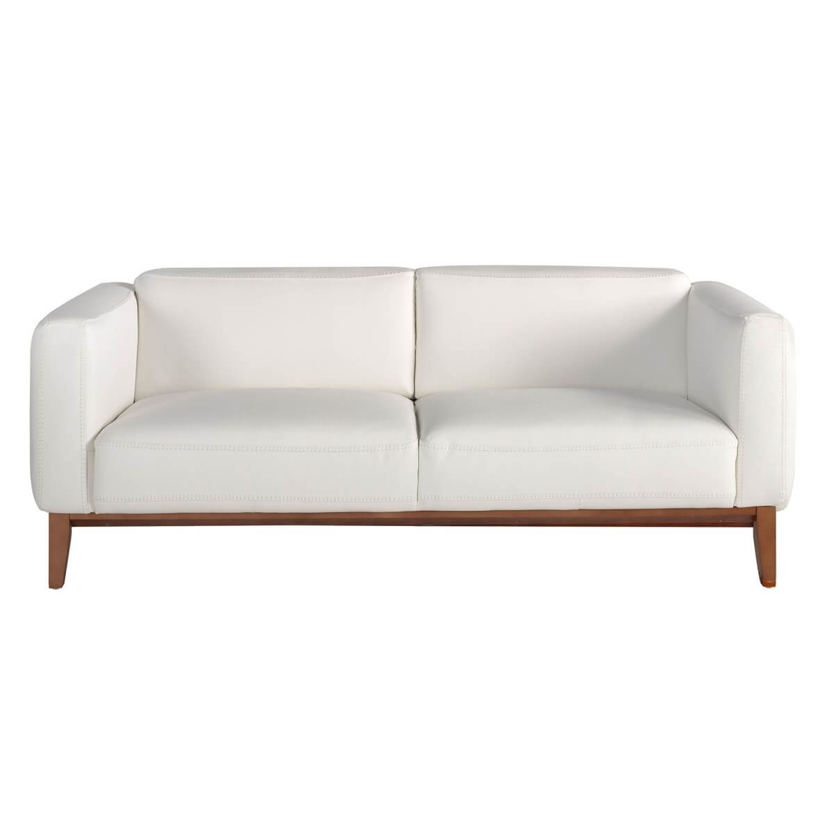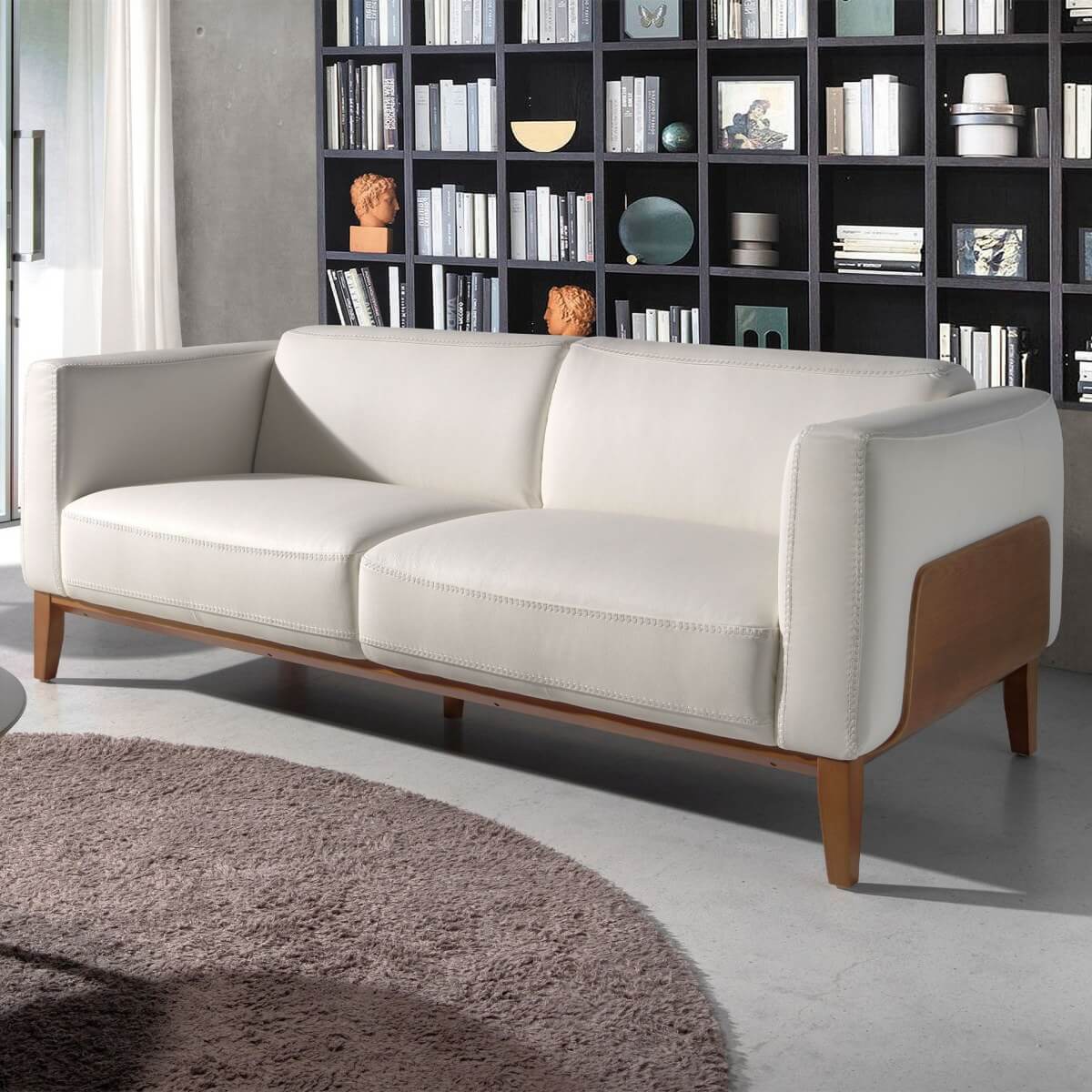Modern dizájnú, 3 személyes, fehér marhabőrrel kárpitozott kanapé. Stílusának, valamint dió színűre pácolt tölgyfa szegélyének és dió színű fa lábainak köszönhetően ez a kanapé az avantgárd és elegancia érzetét kelti otthonában.