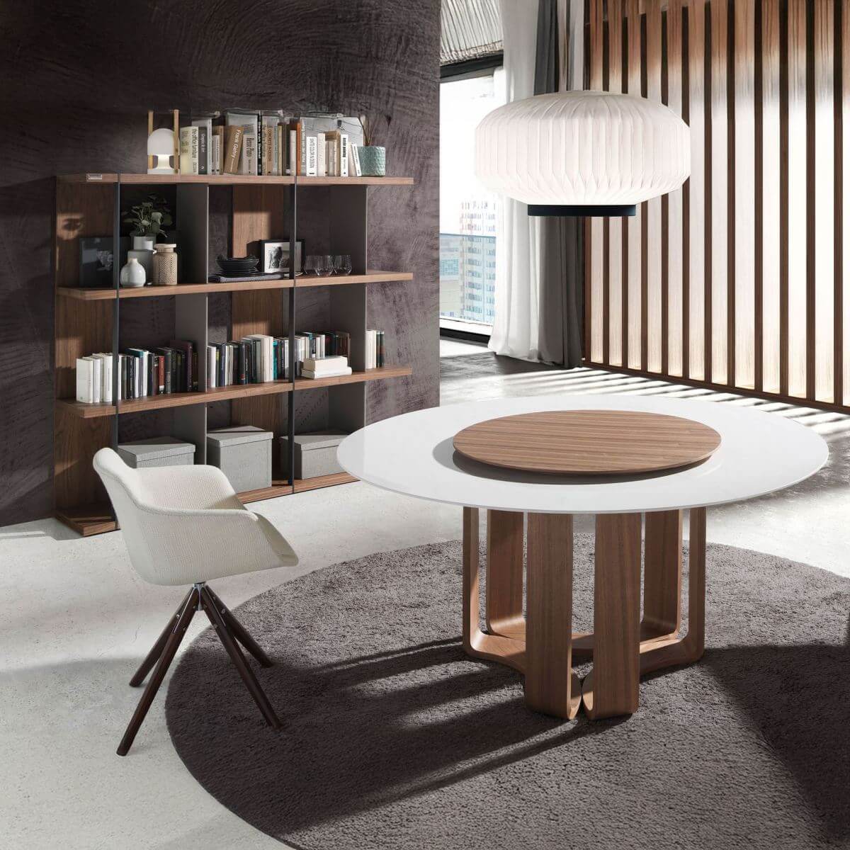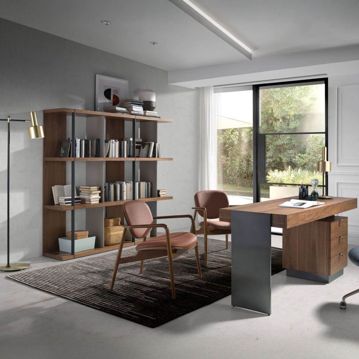 Dió furnérozott fa polcrendszer két polccal. Szürkére lakkozott MDF fából és fekete epoxigyantával festett rozsdamentes acélból készült függőleges oldalak.