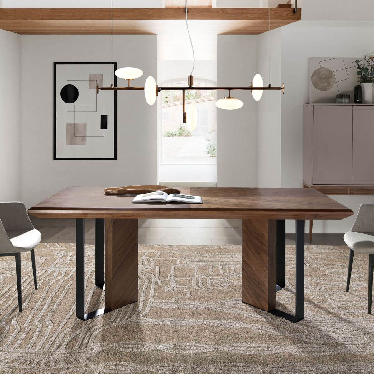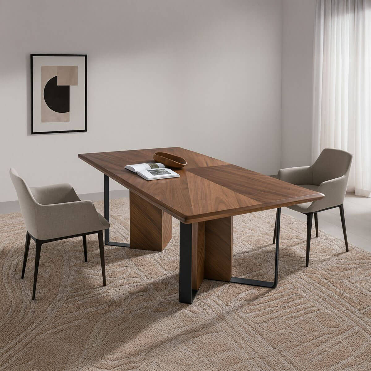 Modern dizájnú téglalap alakú étkezőasztal fix tetejű és natúr dió furnérozott fa szerkezettel. Tökéletes asztal, amely fényt és modernitást visz konyhájába, nappalijába vagy étkezőjébe.