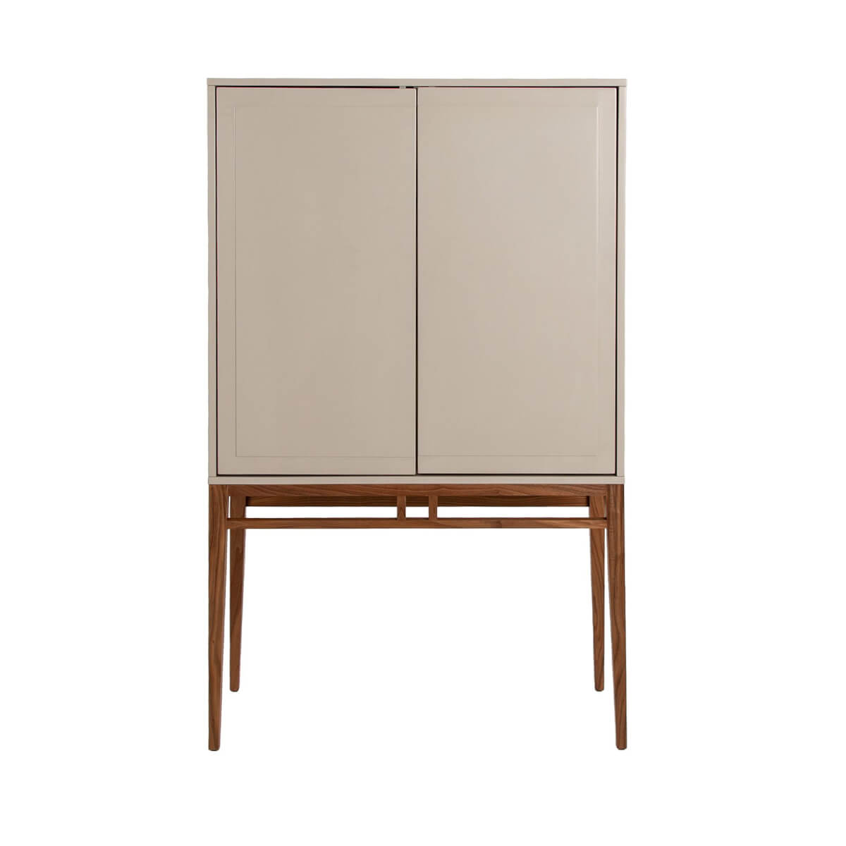 Modern dizájnú, magas tálalószekrény bézs MDF fa szerkezettel és eredeti natúr dió furnérral borított fa lábakkal. Nagy tárolóhellyel rendelkezik, 2 ajtóval, toló-húzó nyílással és lágyan záródó rendszerrel.