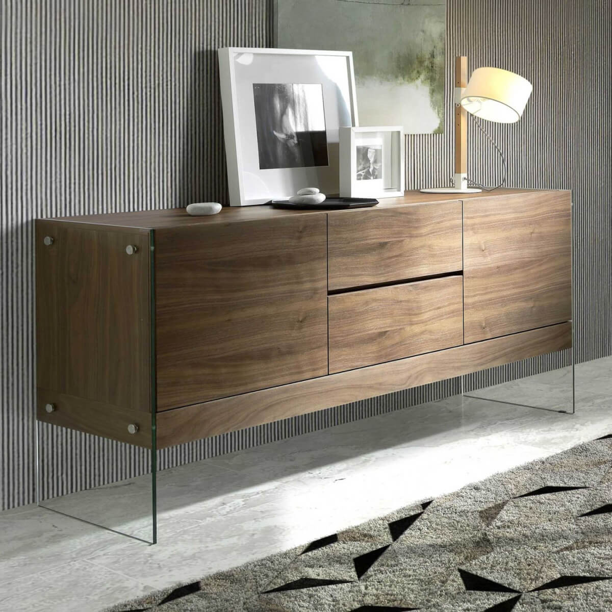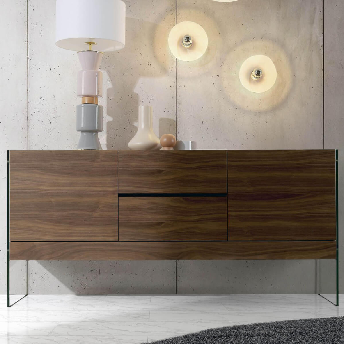 Modern dizájnú tálalószekrény natúr diófa furnérral és eredeti edzett üveg lábakkal. Nagy tárolóhellyel rendelkezik, 2 fiókkal, körmös nyitással és lágyan záródó rendszerrel, valamint 2 ajtóval, körmös nyitással és lágyan záródó rendszerrel.