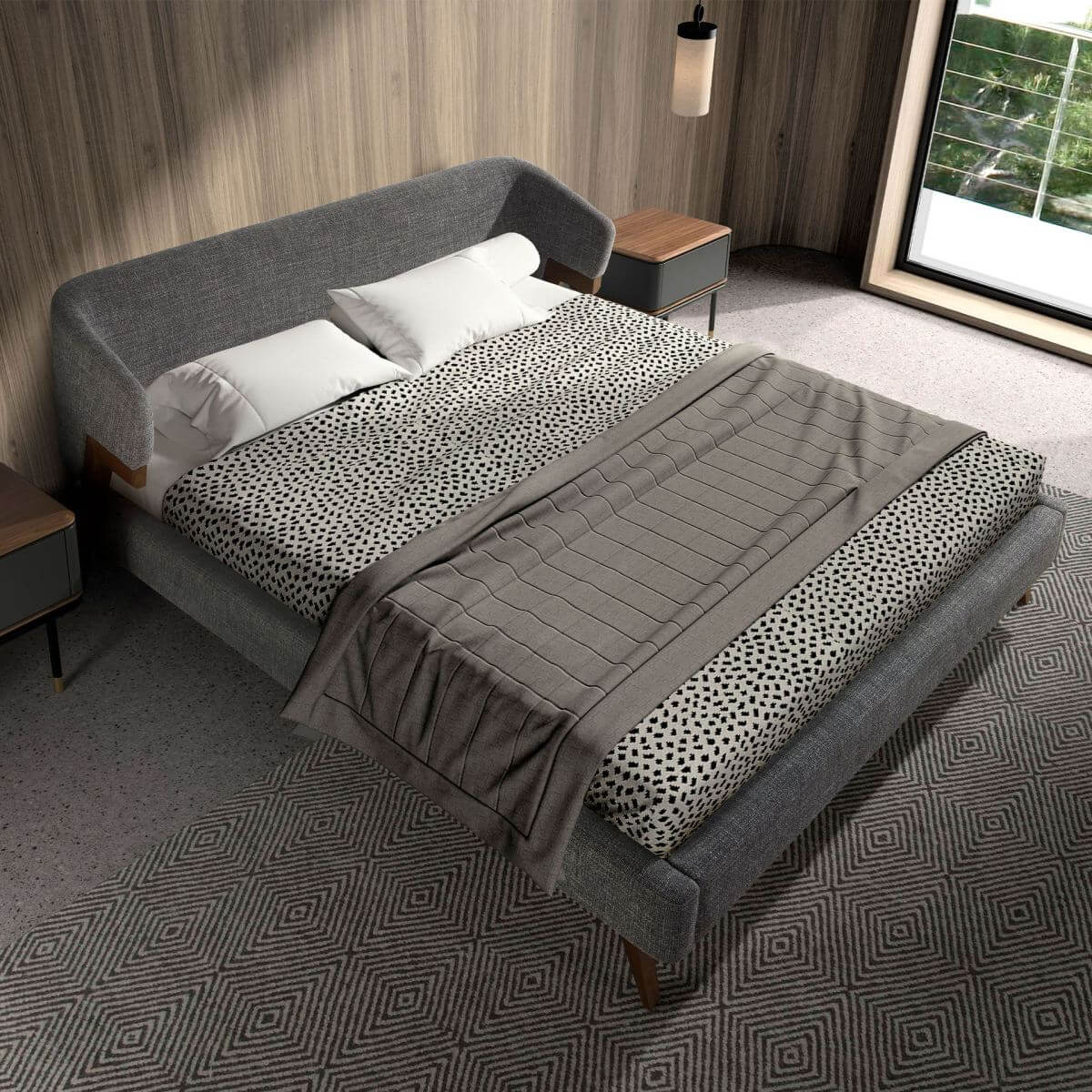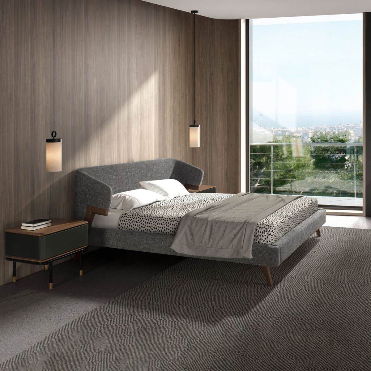 Modern dizájnú franciaágy eredeti fejtámlával és szürke szövetből készült szerkezettel, valamint natúr diófa furnérozott falábakkal. Kulcsfontosságú darab hálószobájába, amellyel elegáns és otthonos stílust teremt.