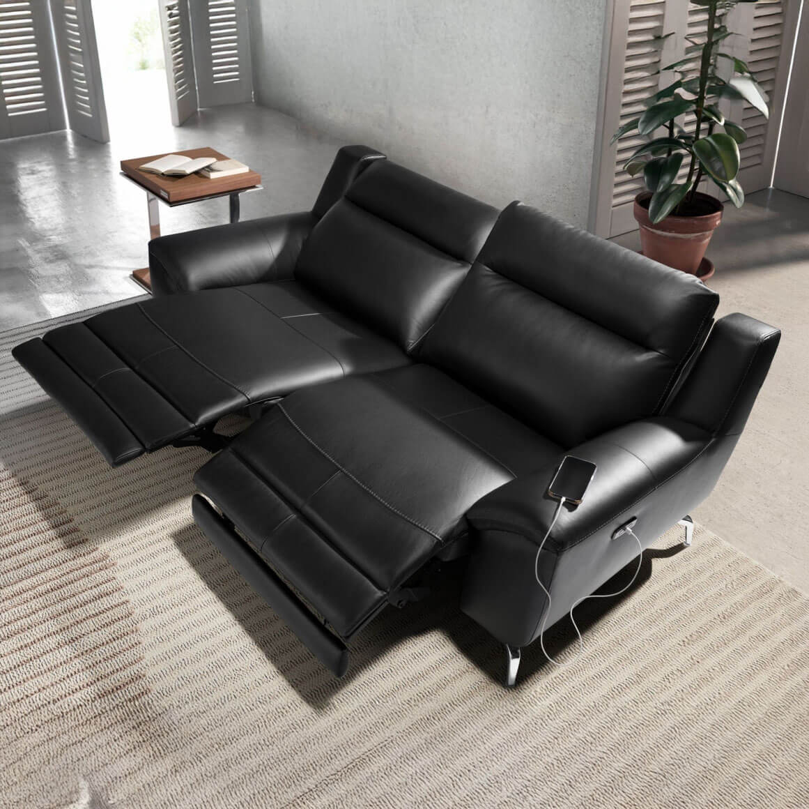 Kétszemélyes relax kanapé modern dizájnnal, fekete marhabőrrel kárpitozva. Stílusának és krómozott rozsdamentes acél lábainak köszönhetően ez a kanapé az avantgárd és elegancia érzetét kelti otthonában. 2 elektromos relaxációs rendszere biztosítja a pihenéshez szükséges extra kényelmet.