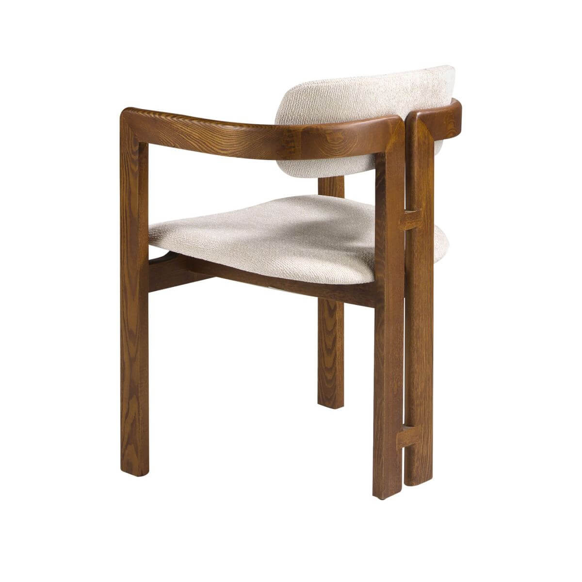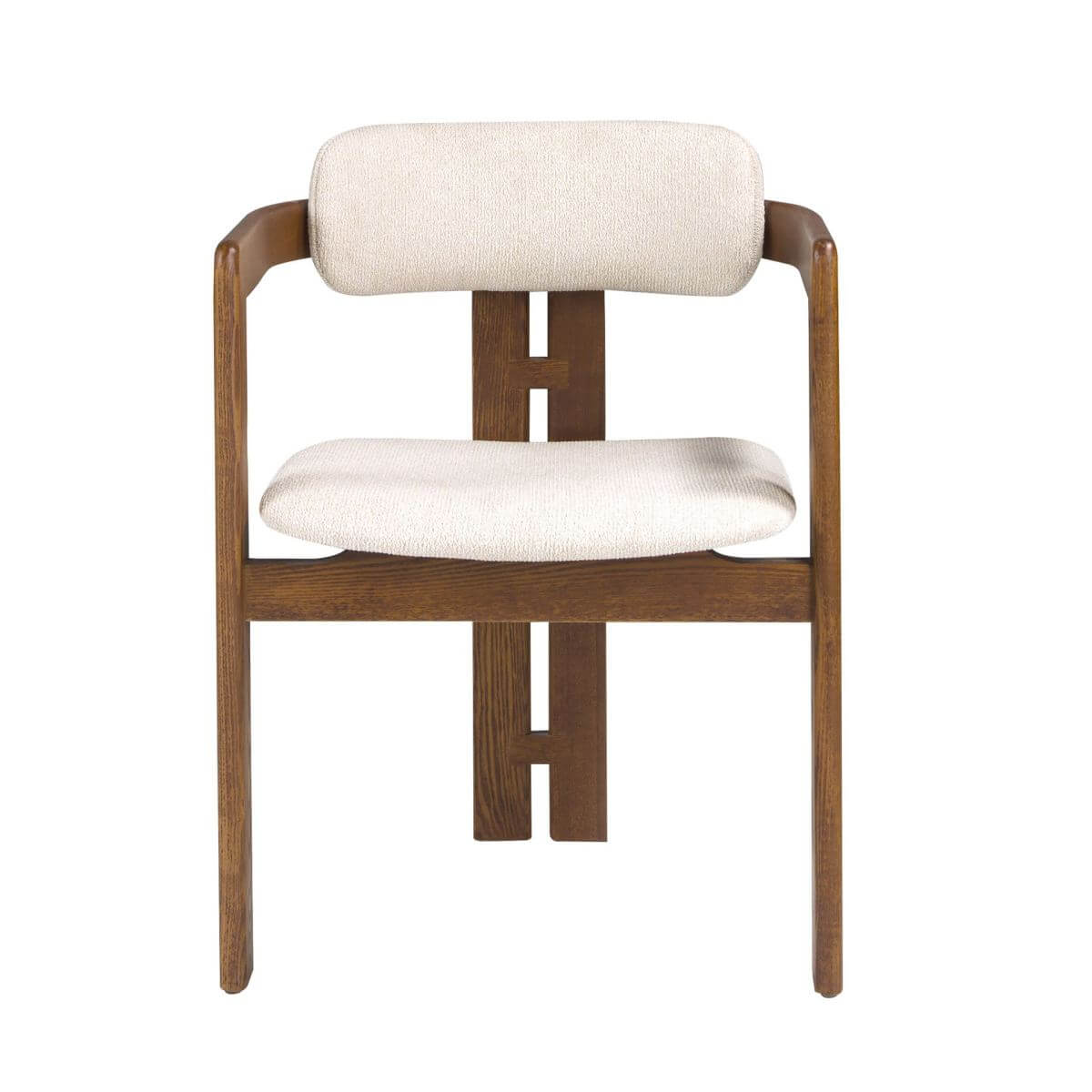 Modern dizájnú karfás szék törtfehér szövettel kárpitozott ülőfelülettel és háttámlával. Dió színű, avantgárd, mégis időtlen stílusú fa lábai kötelező darabbá teszik konyhájában vagy étkezőjében.