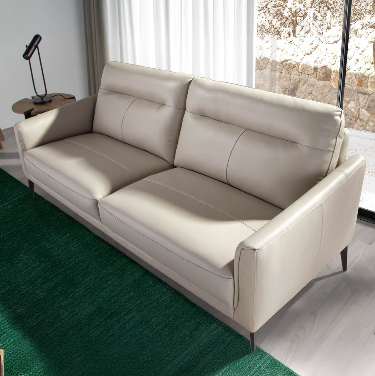 Modern dizájnú, kétszemélyes kanapé, bézs szürke marhabőrrel kárpitozva. Stílusának és fekete epoxigyantával festett rozsdamentes acél lábainak köszönhetően ez a kanapé egy csipetnyi avantgárdot és eleganciát visz otthonába, amire vágyik.