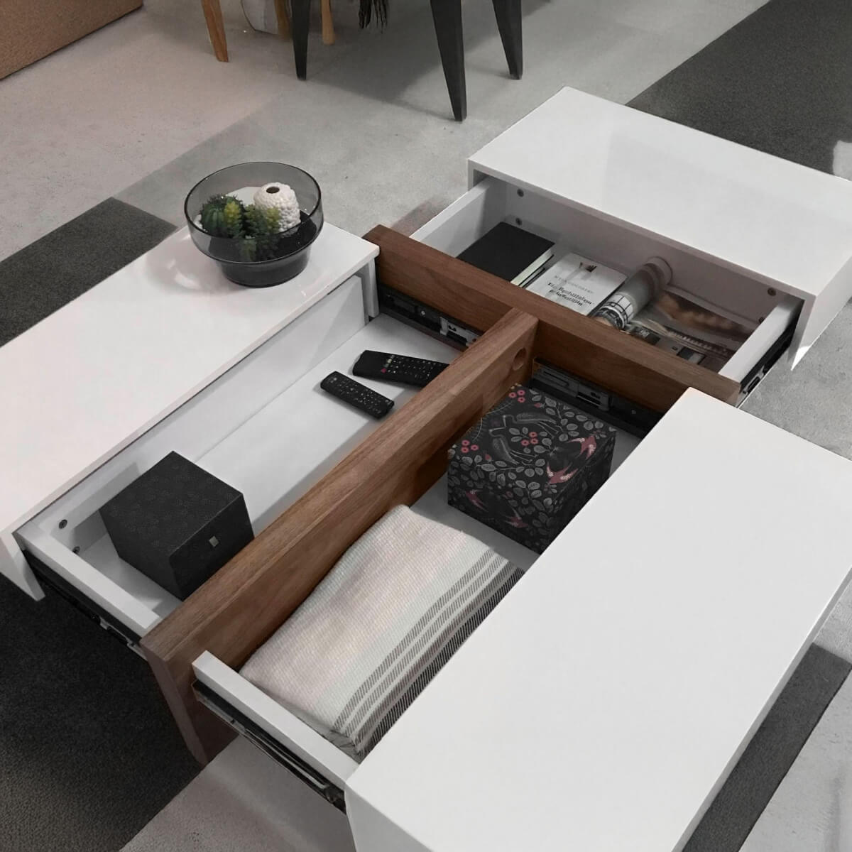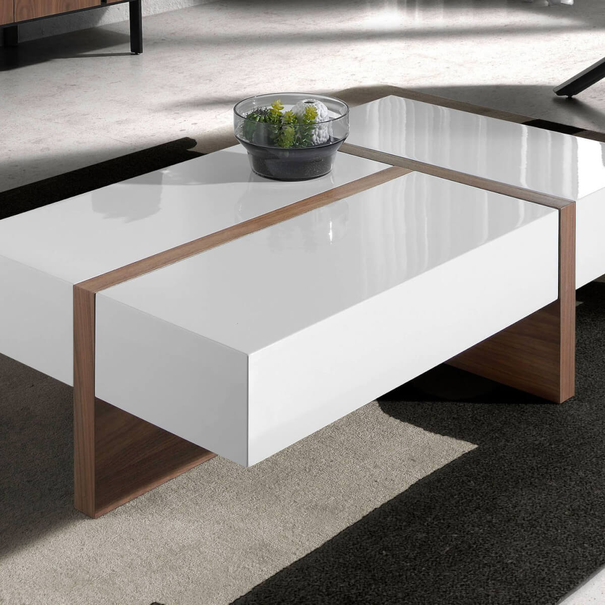 Modern dizájnú, téglalap alakú dohányzóasztal fehér MDF fából. A natúr diófával borított falábak szerkezete modern és avantgárd hatást kelt, amit otthonába keres.