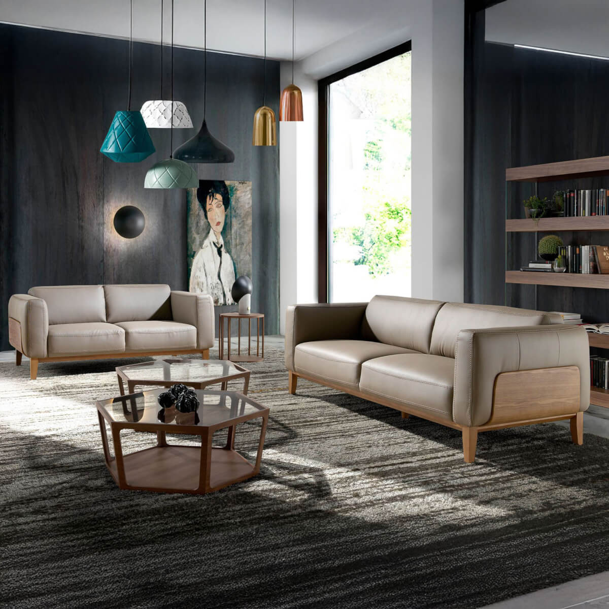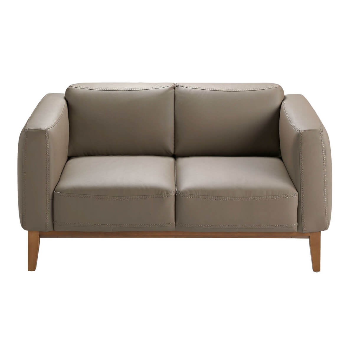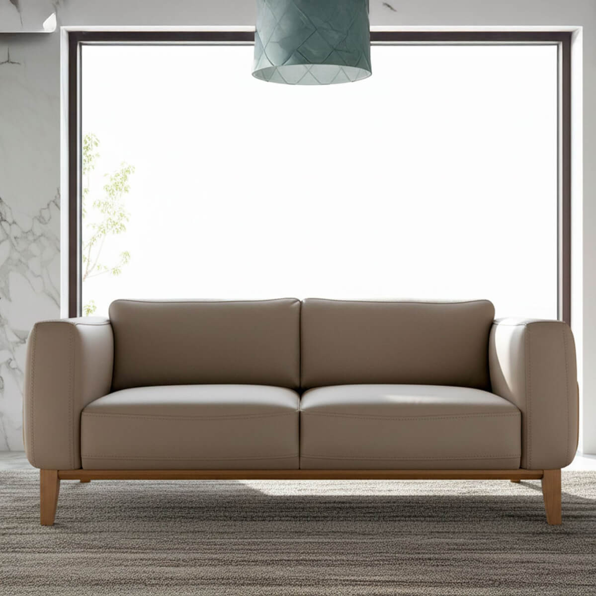 Modern dizájnú, kétszemélyes kanapé, nerc színű marhabőrrel kárpitozva. Stílusának, valamint dió színűre pácolt tölgyfa szegélyének és dió színű fa lábainak köszönhetően ez a kanapé azt az avantgárd és eleganciát viszi otthonába, amelyet keres.