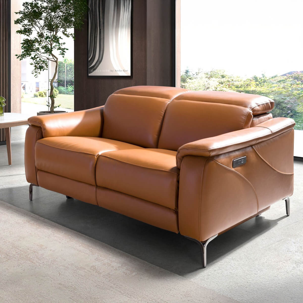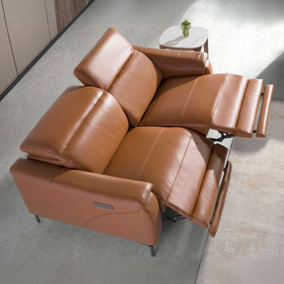 Modern dizájnú, kétszemélyes, barna marhabőrrel kárpitozott, relaxációs kanapé fejtámlával az extra kényelem érdekében. Stílusának és sötét krómozott rozsdamentes acél lábainak köszönhetően ez a kanapé egy csipetnyi avantgárdot és eleganciát visz otthonába, amire vágyik. 2 elektromos relaxációs rendszere biztosítja a pihenéshez szükséges extra kényelmet.