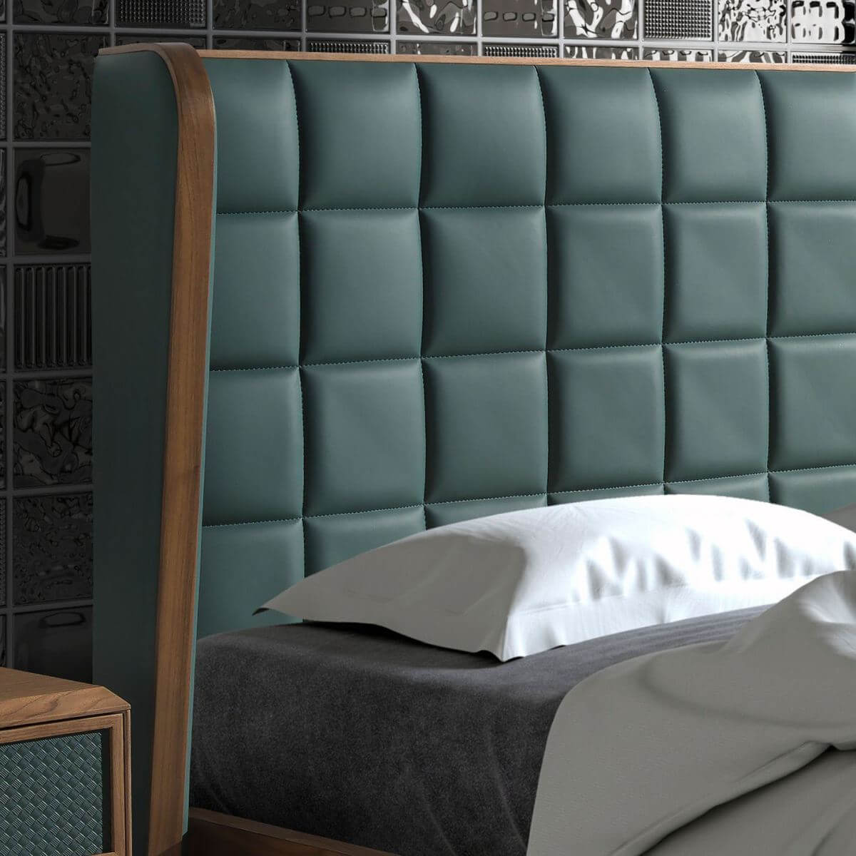 Modern dizájnú franciaágy eredeti sötétzöld műbőr fejtámlával és natúr diófa furnérozott fa szerkezettel. Kulcsfontosságú darab hálószobájába, amellyel elegáns és otthonos stílust kölcsönözhet magának. Kényelmes, fenyőfából készült ágyrácsot is tartalmaz.
