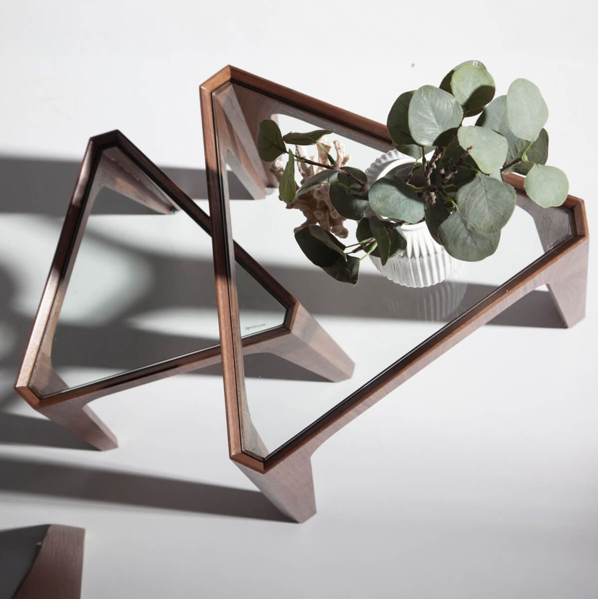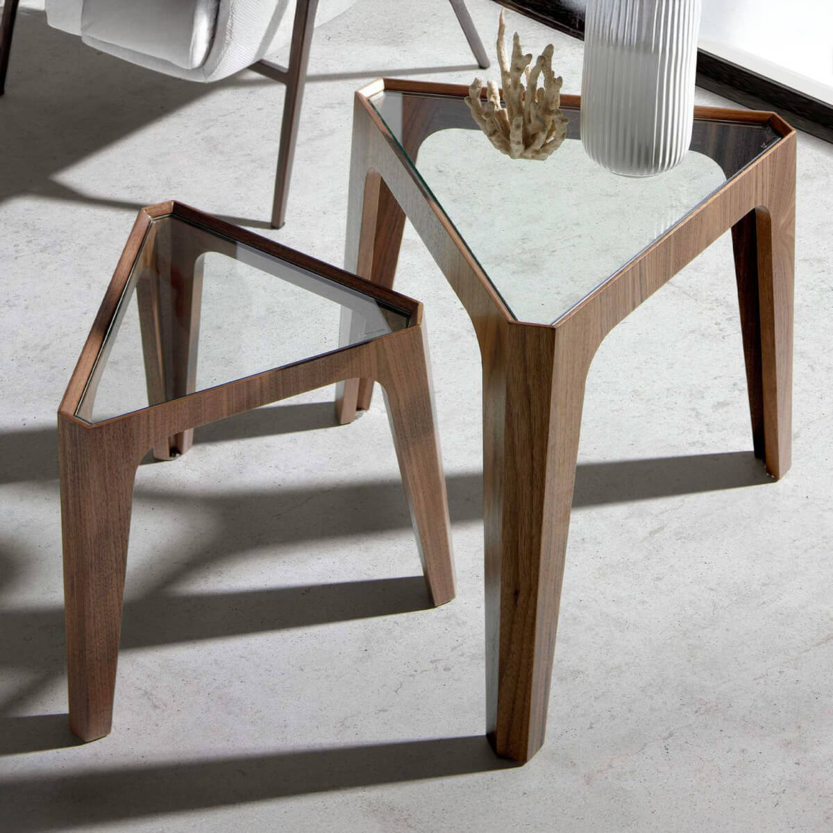 Modern dizájnú, háromszög alakú sarokasztal edzett üveglappal és eredeti, natúr diófa furnérral borított fa lábakkal. Egyszerű, mégis eredeti dizájnnal rendelkező darab, amely egyedi és személyes jelleget kölcsönöz a helyiségnek.