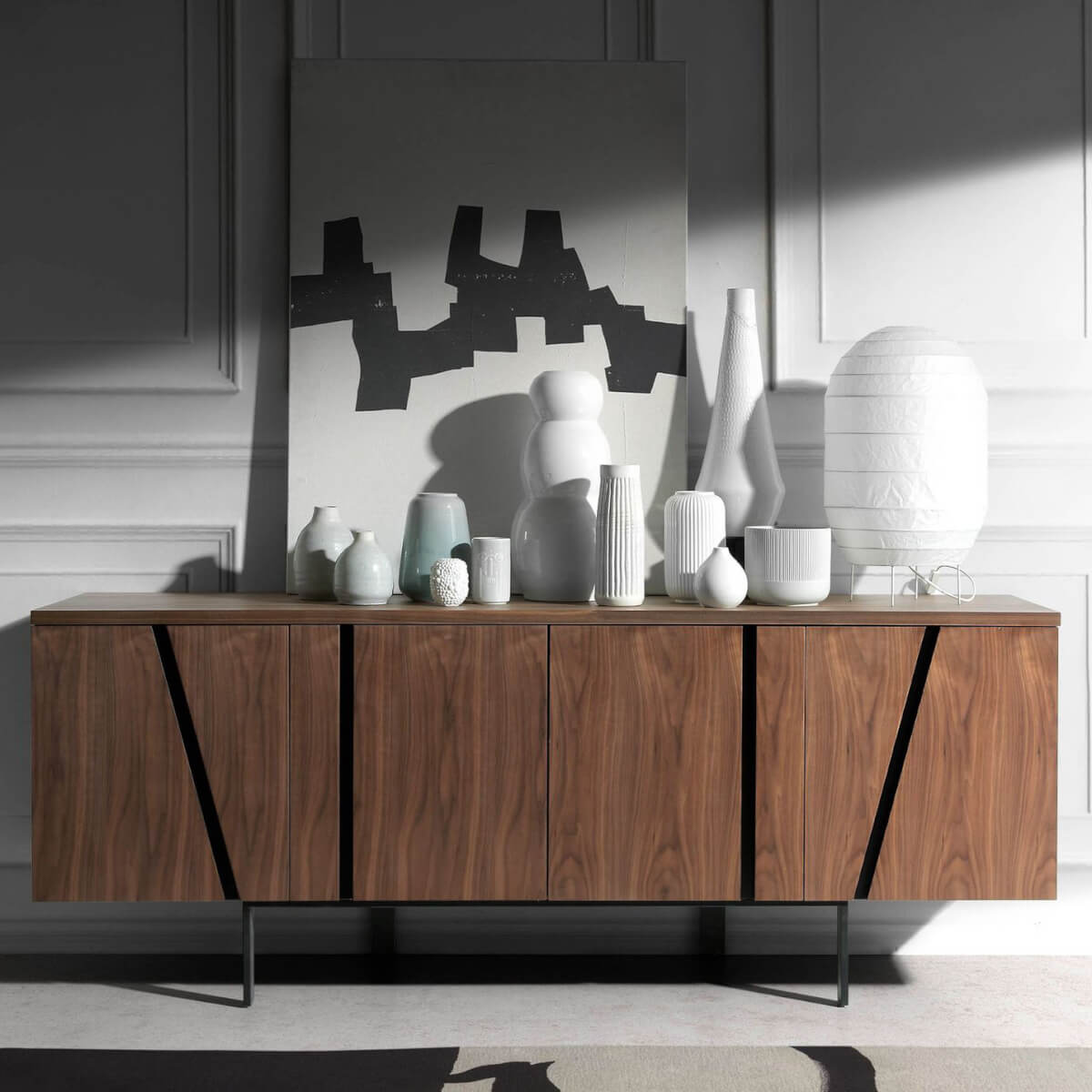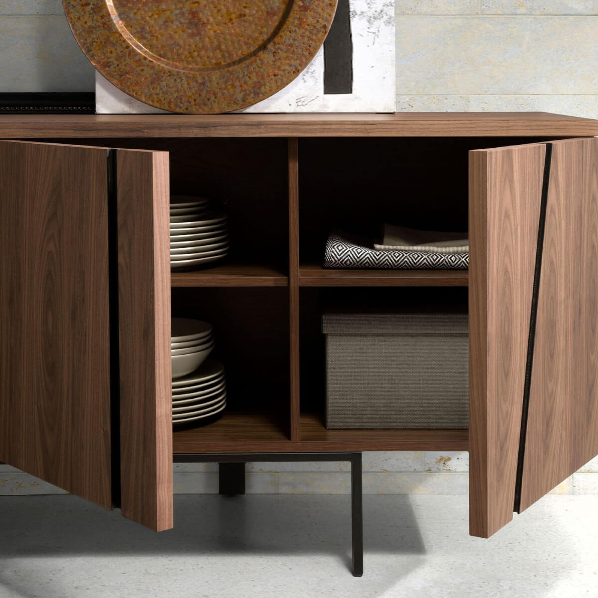 Modern dizájnú tálalószekrény natúr dió furnérral borított fa szerkezettel és eredeti fekete epoxigyantás rozsdamentes acél lábakkal. Eredeti, fekete epoxigyantás rozsdamentes acél részletei tökéletes stílust kölcsönöznek nappalijának. Nagy tárolóhellyel rendelkezik, 4 ajtóval, körmös nyitórendszerrel és lágyan záródó rendszerrel.