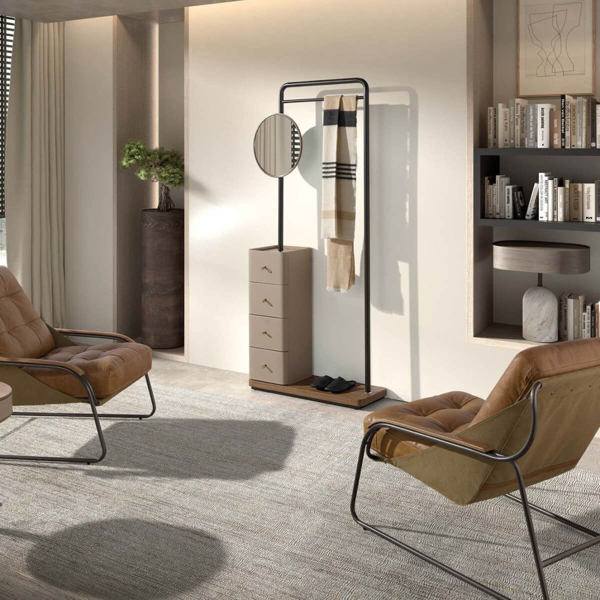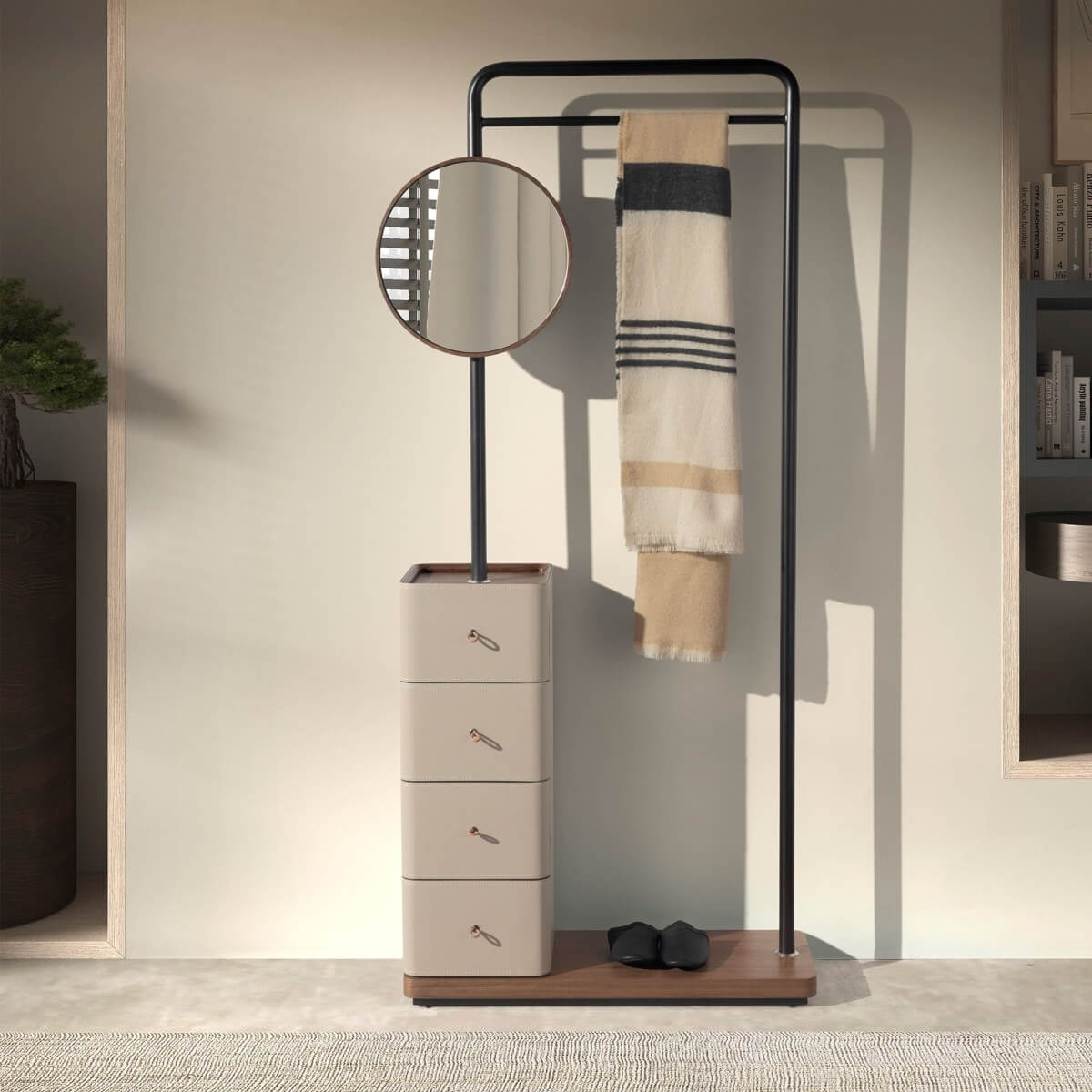 Modern dizájnú kabáttartó, természetes diófa furnérral, elegáns nerc színű marhabőr kárpitozással kombinálva. A fekete rozsdamentes acél talp és szerkezet kifinomult és exkluzív megjelenést kölcsönöz szobájának. Praktikus tükörrel rendelkezik, amely ideális a személyes gondoskodásra szánt idő nyugodt és nyugodt eltöltéséhez, a tágas, 4 fiókos, húzófüles nyitórendszernek és lágyan záródó rendszernek köszönhetően pedig mindent rendben és a helyén tarthat.