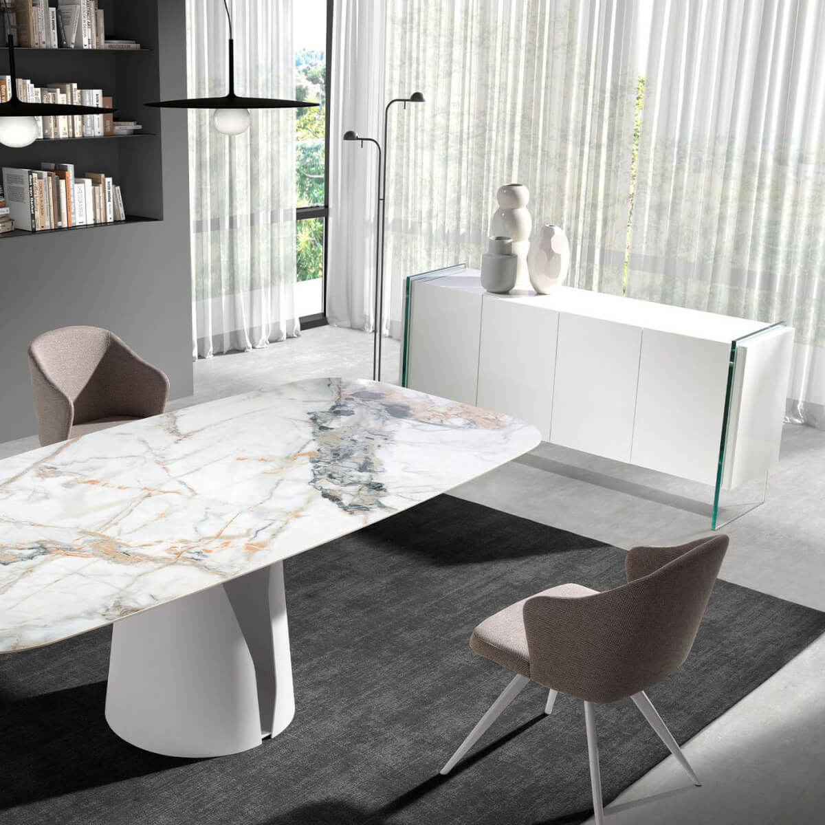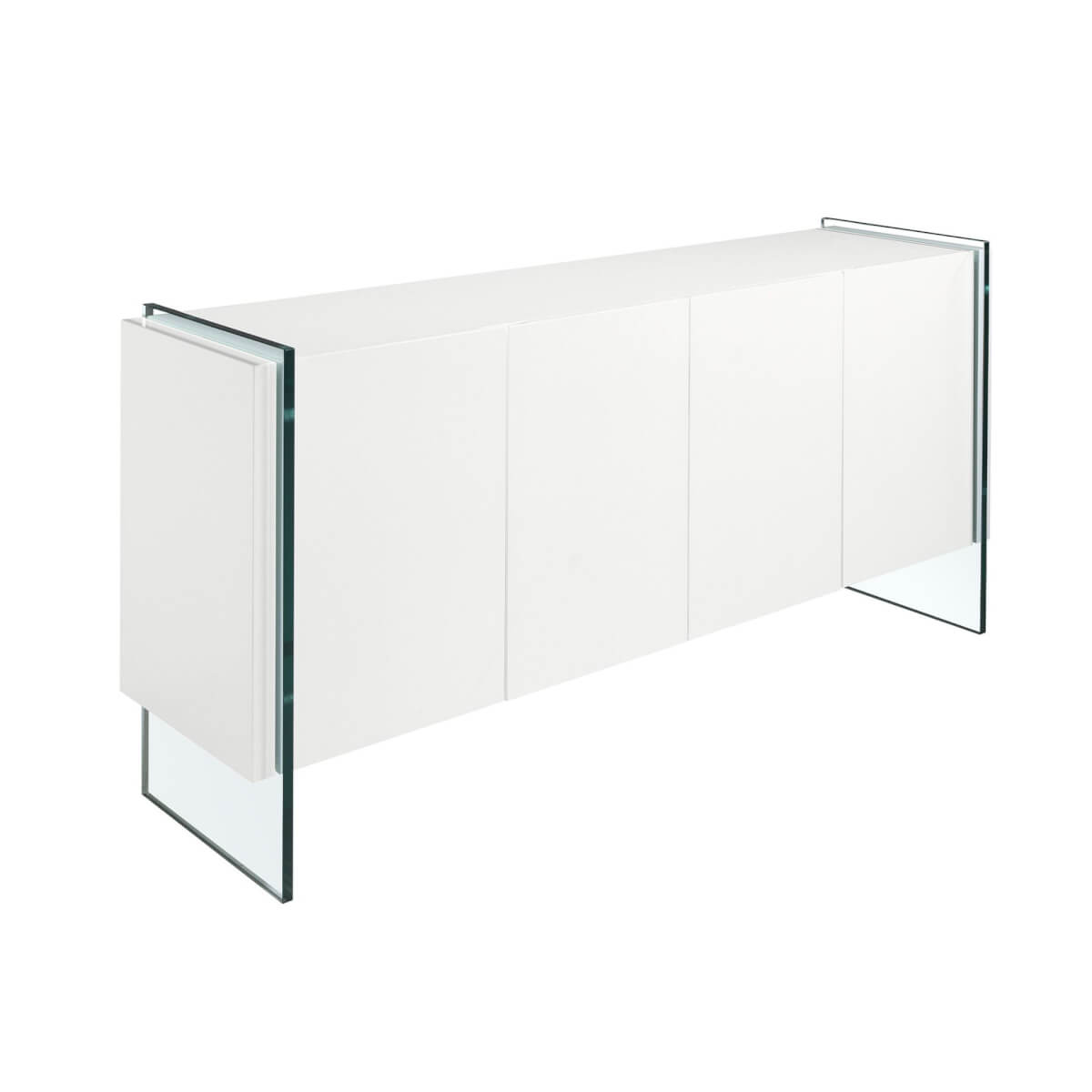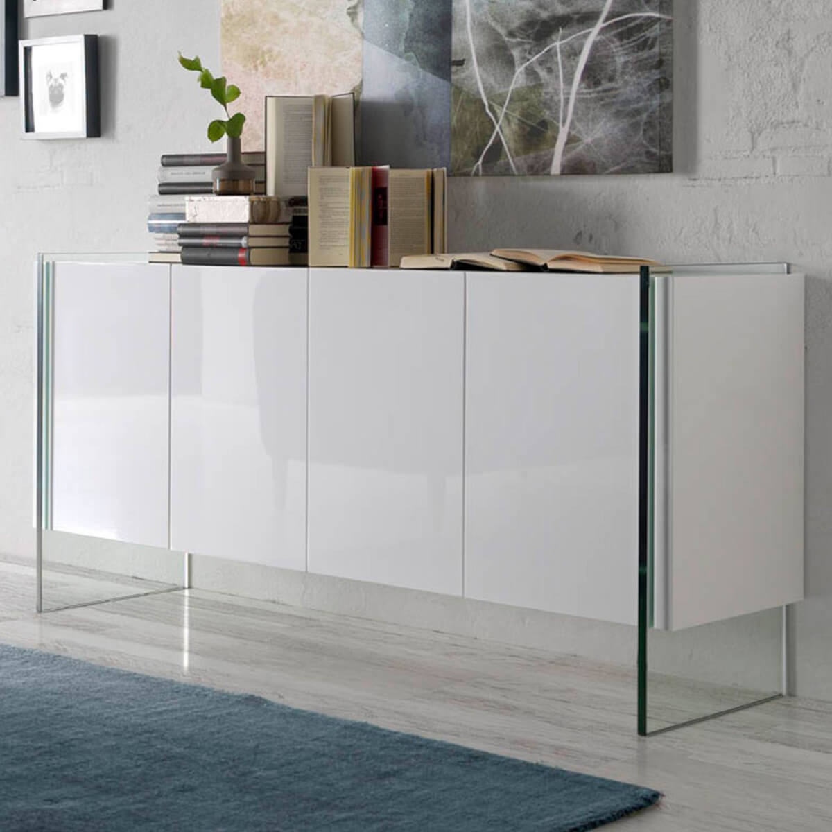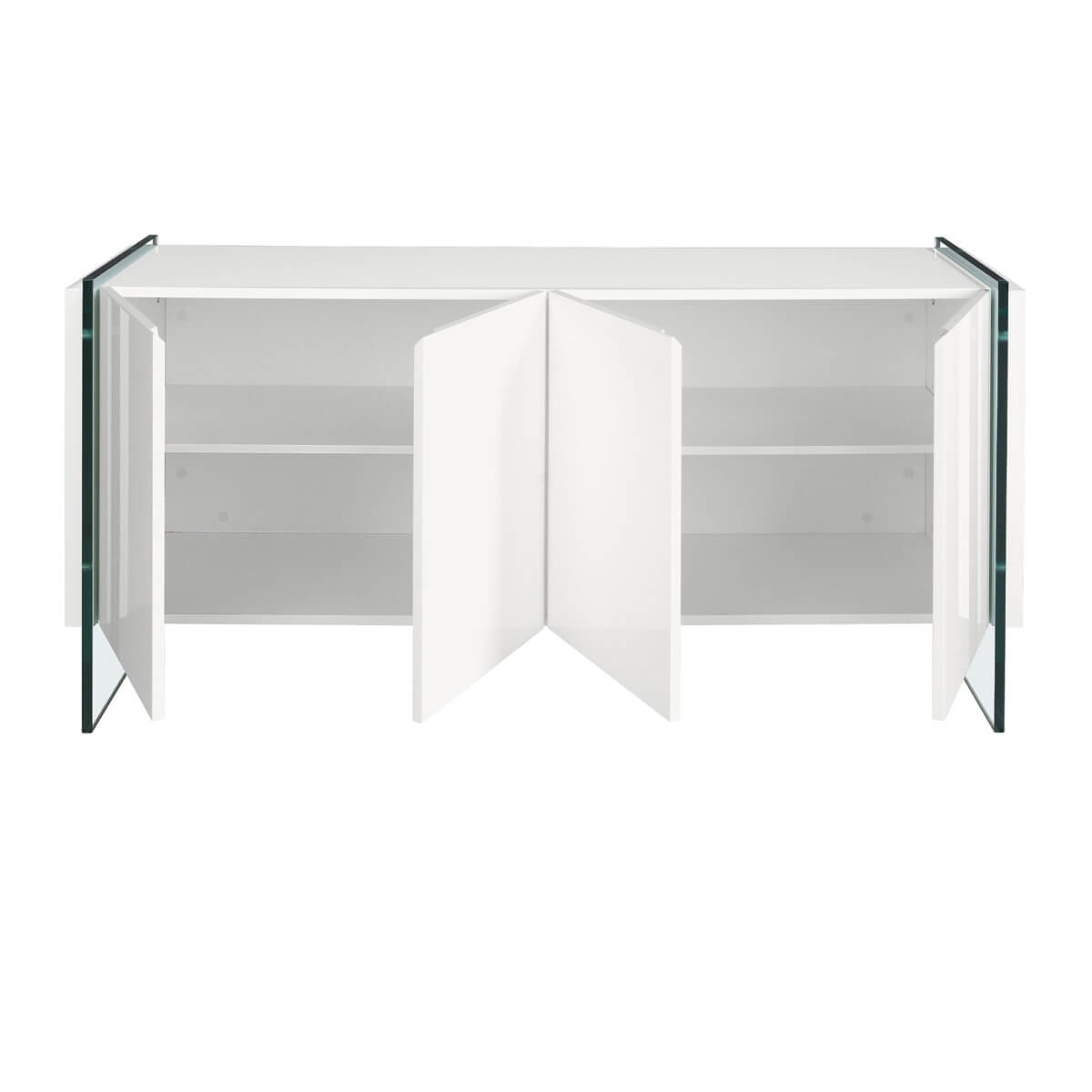 Modern dizájnú tálalószekrény fehér MDF fa szerkezettel és eredeti edzett üveg lábakkal. Nagy tárolóhellyel rendelkezik, 4 ajtóval, körmös nyitórendszerrel és lágyan záródó rendszerrel.